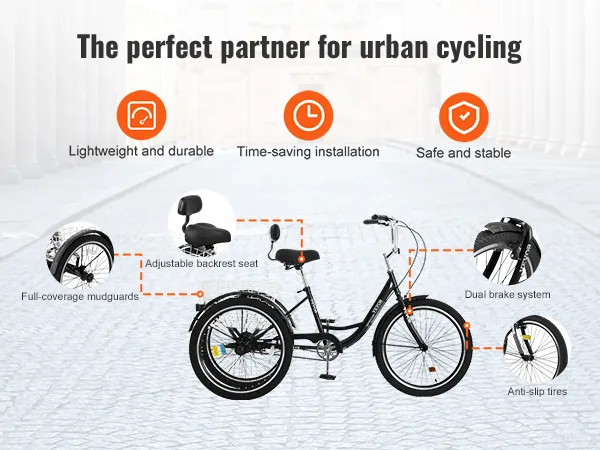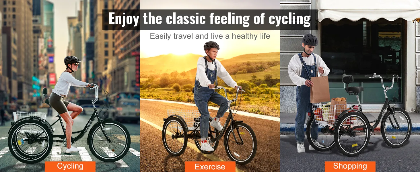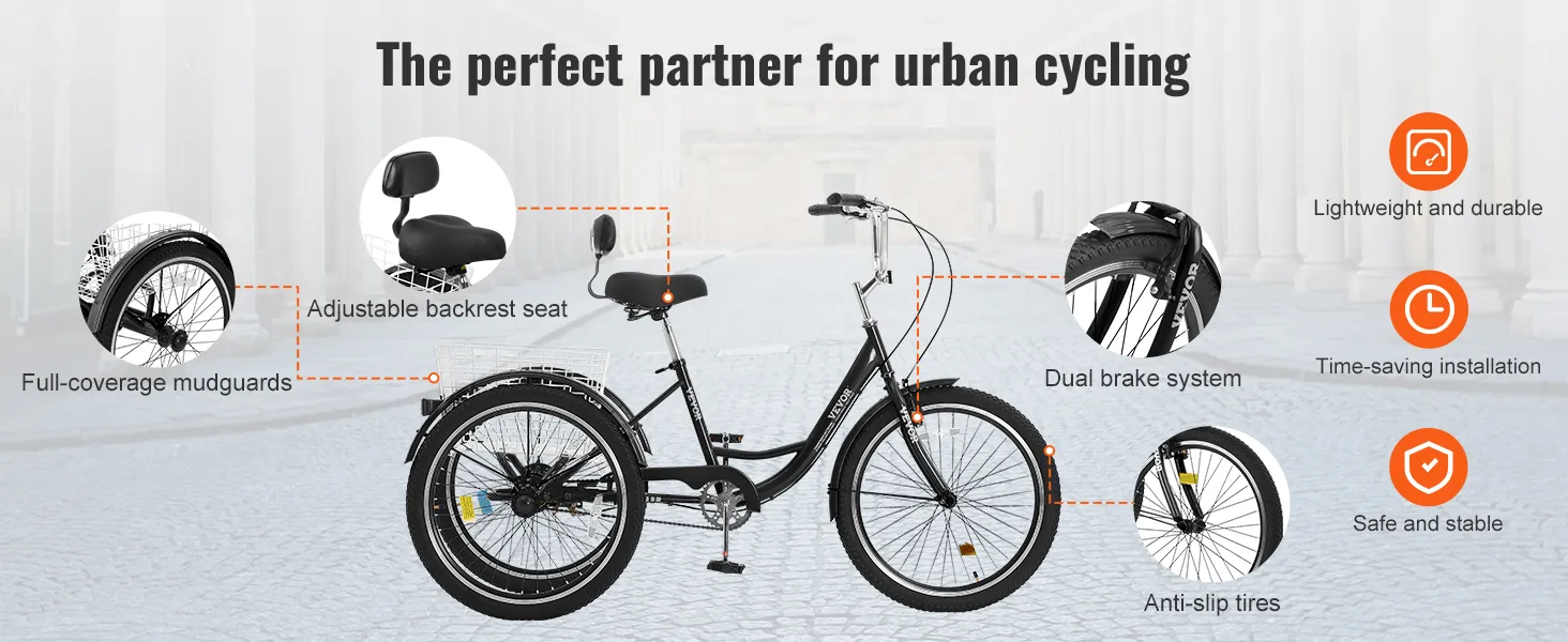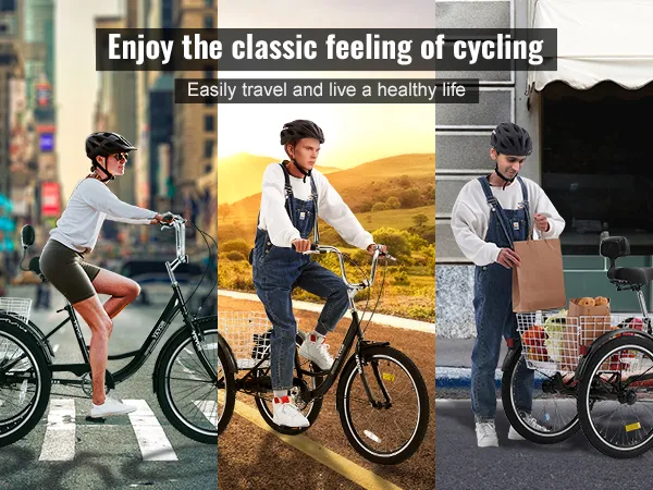 Múltiples opciones de tamaño: múltiples tamaños y colores disponibles. Altura 4'8" - 5'6" adecuada para ruedas de 20"; altura 4'11" - 5'10" adecuada para ruedas de 24"; altura 5'3" - 6'2" adecuado para ruedas de 26". Elija según su situación real. El triciclo para adultos viene con un manual en color, herramientas de montaje, etc. Puede realizar su compra con confianza.