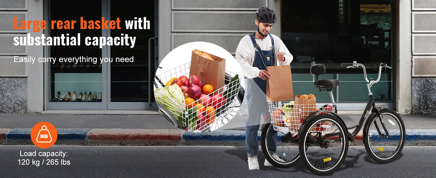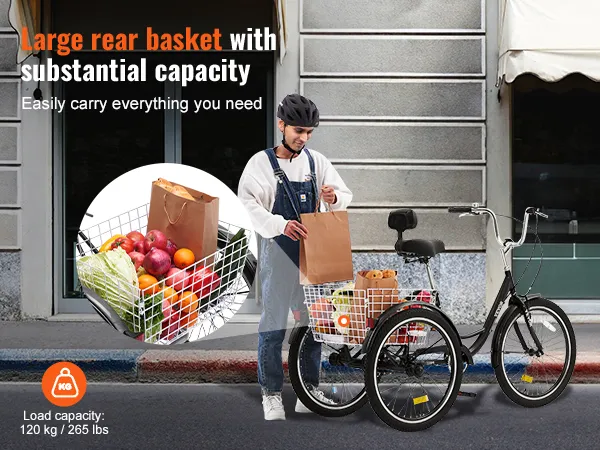 Cesta trasera de gran capacidad: el triciclo para adultos está equipado con una cesta de carga de gran capacidad con una capacidad de carga de hasta 120 kg / 265 lbs. Es perfecto para llevar comestibles, libros u otros elementos esenciales. Ya sea que esté haciendo recados o paseando tranquilamente, la canasta le permite transportar fácilmente todo lo que necesita y no tiene que preocuparse por llevar mucha carga, satisfaciendo las necesidades diarias.
