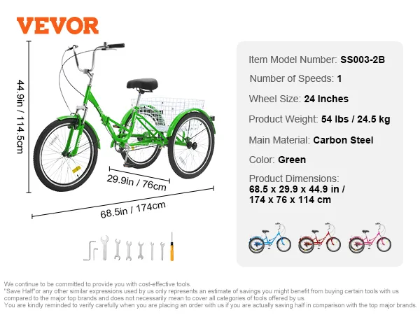 Triciclo plegable para adultos de 24 pulgadas VEVOR: ¡su compañero para viajes cómodos y placenteros! Con una estructura plegable, un marco resistente, un fácil almacenamiento y una conducción cómoda, es la opción perfecta para viajar al trabajo, ir de compras o disfrutar de aventuras al aire libre, lo que lo convierte en su compañero ideal para viajes saludables.