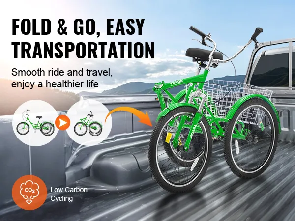Pliegue y listo: el triciclo plegable VEVOR para adultos cuenta con una estructura plegable, lo que garantiza un almacenamiento y transporte sin esfuerzo. Con su marco triangular estable y su canasta espaciosa que soporta hasta 265 libras, es su compañero ideal para viajar, ir de compras o vivir aventuras al aire libre. ¡Pliéguelo, guárdelo en su camioneta y salga a la carretera!