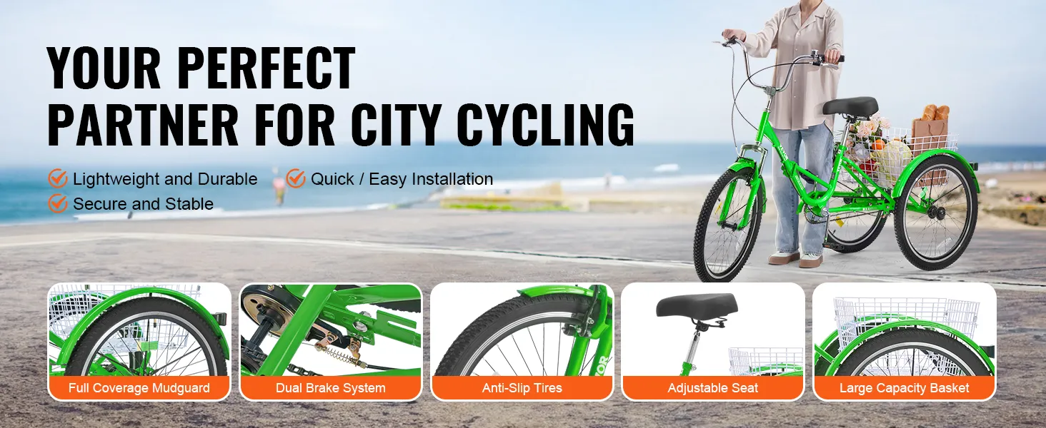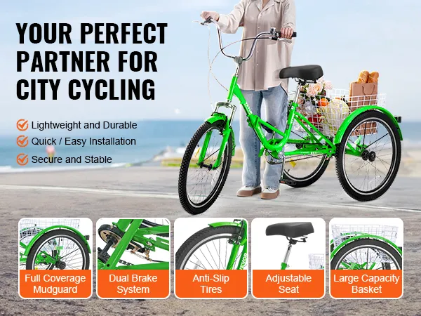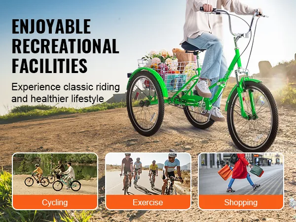 Con un sistema de frenos doble, guardabarros de cobertura total, neumáticos antideslizantes y una gran cesta trasera, el triciclo cruiser de tres ruedas VEVOR ofrece una experiencia de conducción estable y segura. El asiento ajustable y el manillar alto facilitan la búsqueda de la postura de conducción perfecta para un viaje cómodo.