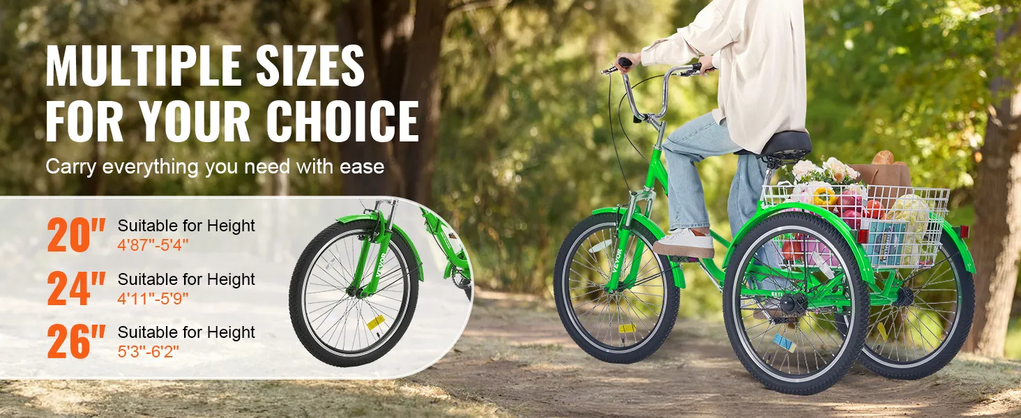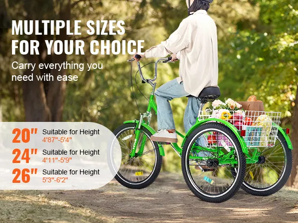 Nuestros triciclos para adultos ofrecen una variedad de opciones de tamaño adecuadas para usuarios de diferentes alturas. La rueda de 20 pulgadas es ideal para personas de entre 4'8'' y 5'4'' de altura, la de 24 pulgadas es adecuada para personas de entre 4'11'' y 5'9'', y la de 26 pulgadas es adecuada para personas de entre 5'3'' y 6'2''.