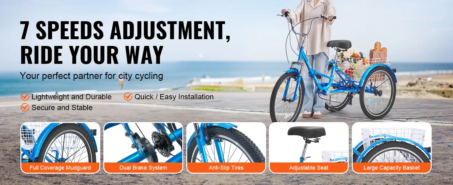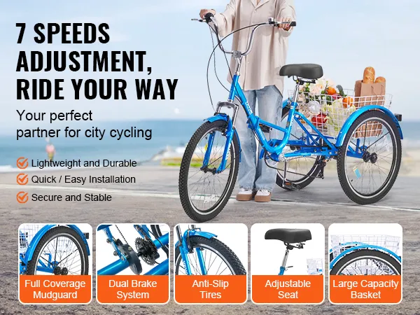 Ajustable de 7 velocidades: el triciclo de crucero plegable de 3 ruedas VEVOR adopta un sistema de transmisión Shimano de 7 velocidades con engranajes ajustables, lo que garantiza recorridos fluidos y estables en carreteras cuesta arriba, cuesta abajo y planas. Navega por la ciudad con confianza y estabilidad, realzadas por los guardabarros de cobertura total.