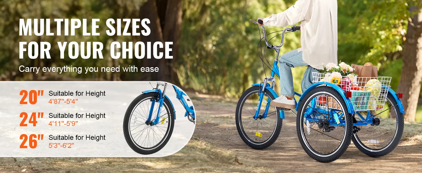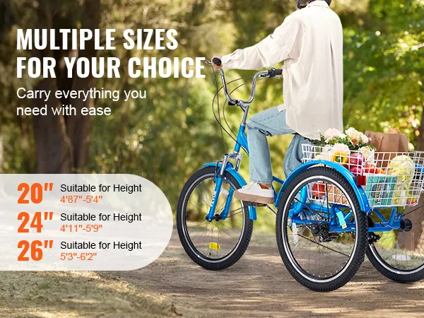 Nuestros triciclos para adultos ofrecen una variedad de opciones de tamaño adecuadas para usuarios de diferentes alturas. La rueda de 20 pulgadas es ideal para alturas de 4'8'' a 5'4'', la de 24 pulgadas es adecuada para alturas de 4'11'' y 5'9'', y la de 26 pulgadas es adecuada para alturas de 5'. 3'' a 6'2''.