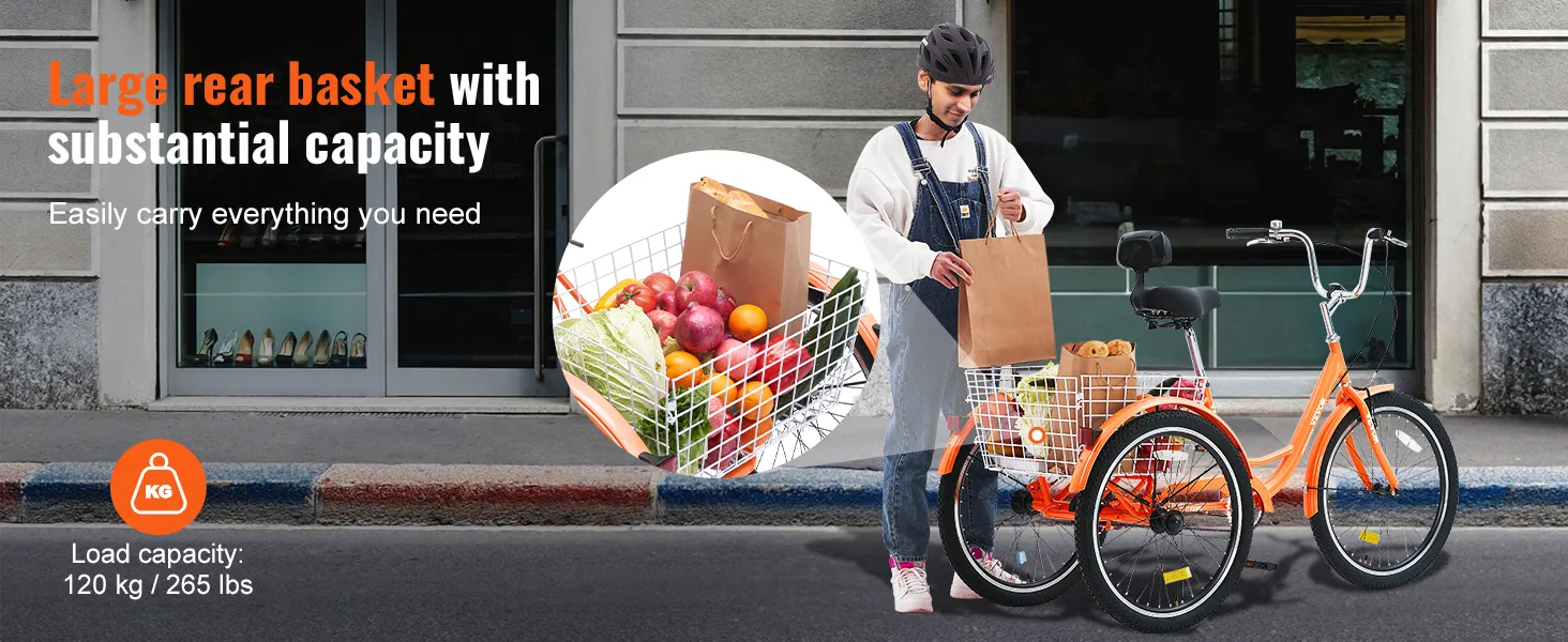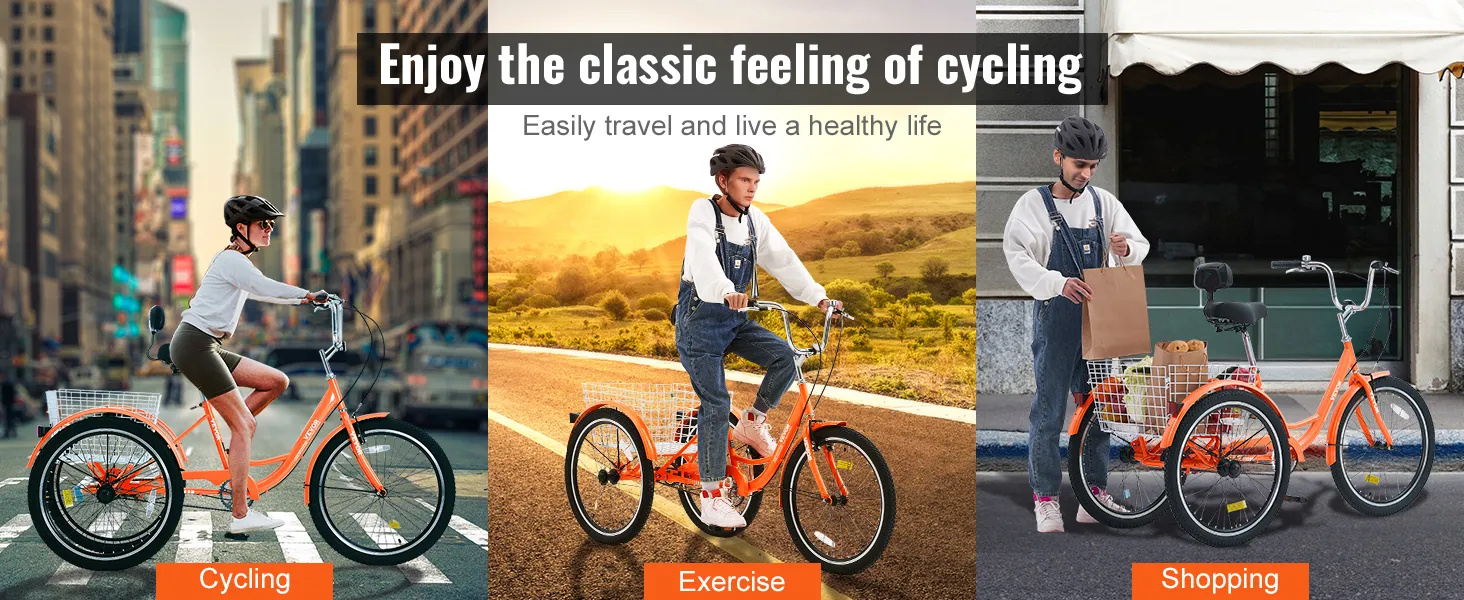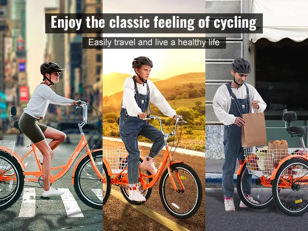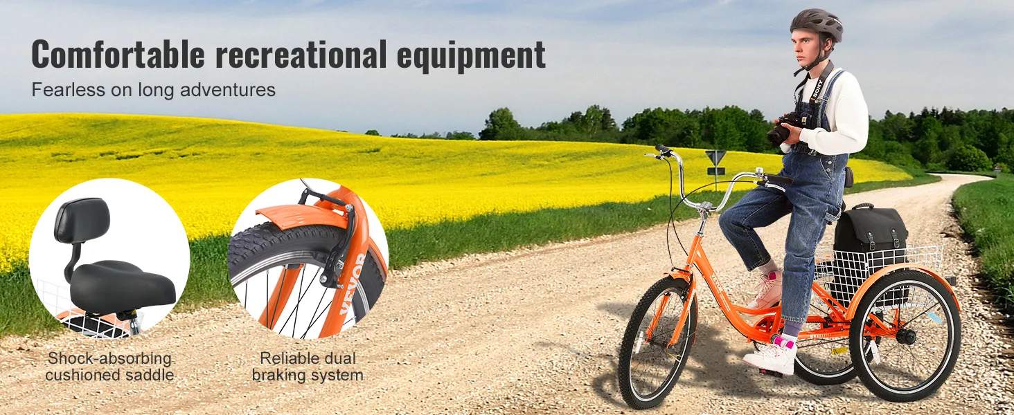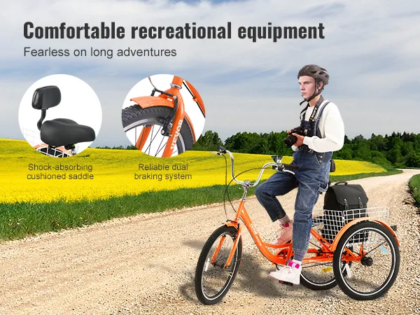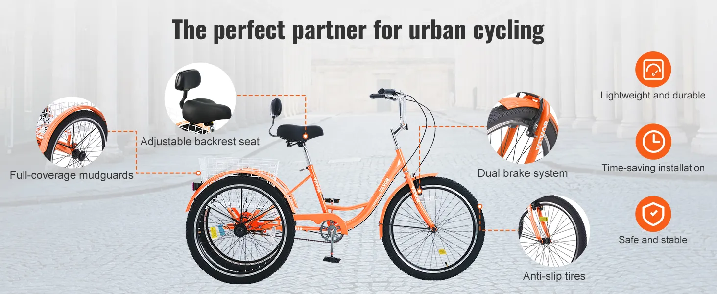 VEVOR Triciclos para adultos de 26 pulgadas, triciclos de 3 ruedas, bicicleta de crucero de acero al carbono con cesta y asiento ajustable, ideal para picnics, compras, para personas mayores, mujeres y hombres (naranja)