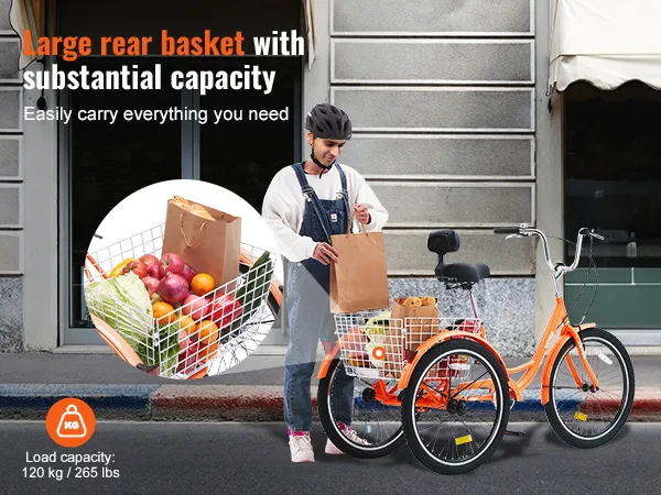 Cesta trasera de gran capacidad: la bicicleta de tres ruedas para adultos está equipada con una cesta de carga de gran capacidad con una capacidad de carga de hasta 120 kg/265 lb. Es perfecta para llevar comestibles, libros u otros elementos esenciales. Ya sea que esté haciendo recados o andando tranquilamente, la cesta le permite llevar fácilmente todo lo que necesita y no tiene que preocuparse por llevar una gran cantidad de carga, satisfaciendo las necesidades diarias.