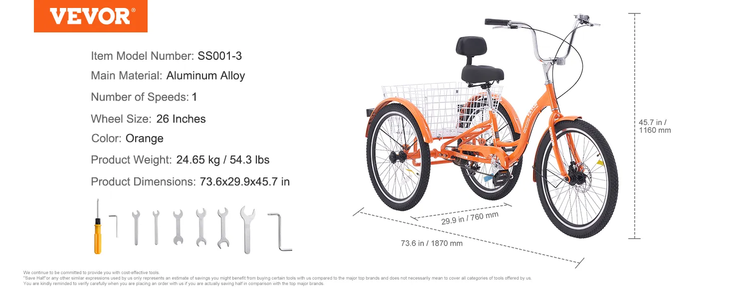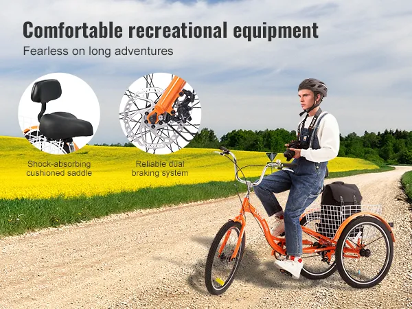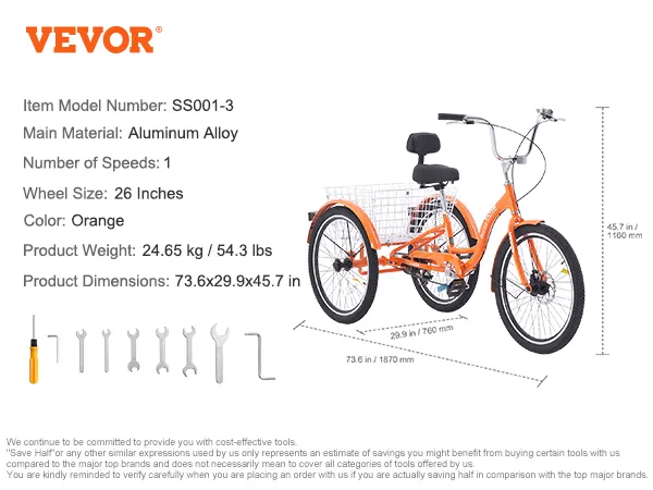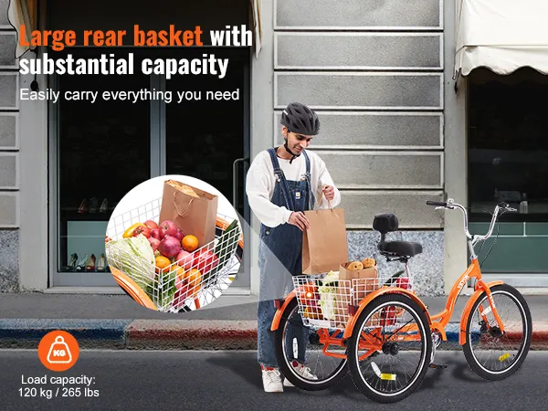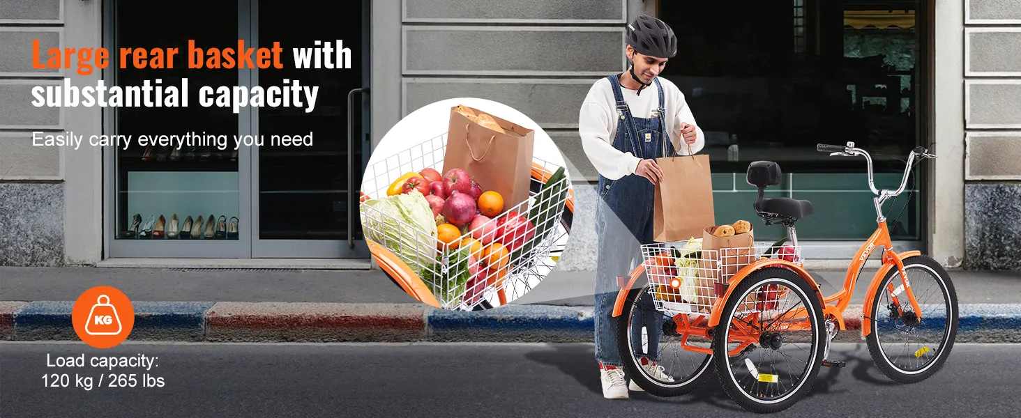 VEVOR - Triciclo para adultos de 26 pulgadas, de aleación de aluminio, con cesta y asiento ajustable, ideal para picnics, compras, para personas mayores, mujeres y hombres (naranja)