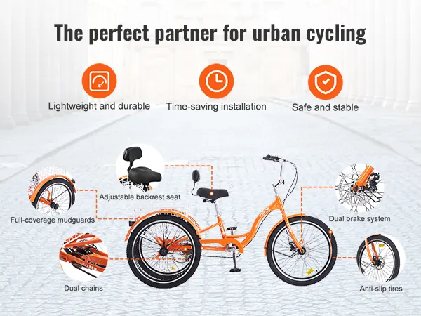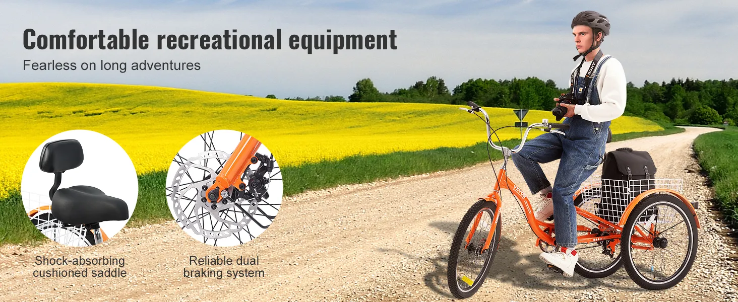 Diseño de cadena doble de una sola velocidad: la construcción de una sola velocidad es simple y fácil de usar. El diseño de cadena doble simplifica los pasos de instalación, preajusta los frenos y solo requiere la instalación de las ruedas y la conexión del buje para su uso. El triciclo para adultos está diseñado paso a paso, es fácil de manejar, apto para principiantes, adecuado para personas mayores, mujeres y hombres, lo que lo convierte en su opción preferida para viajes saludables.