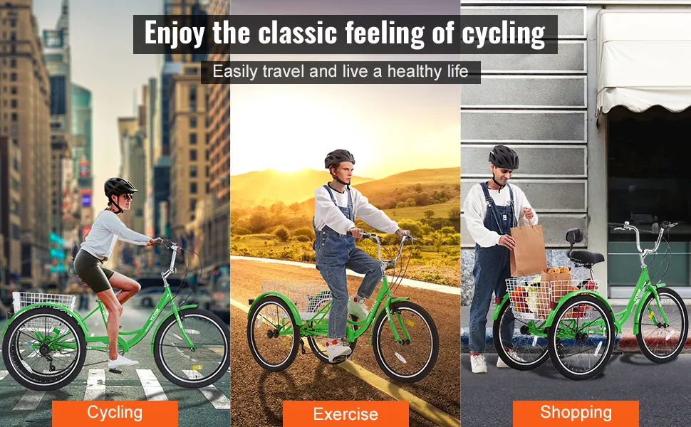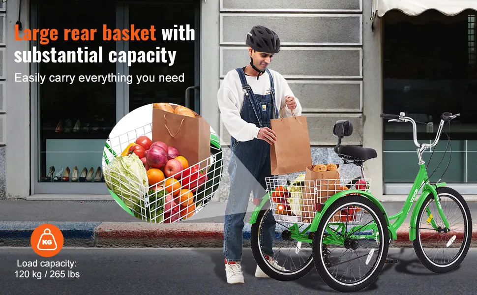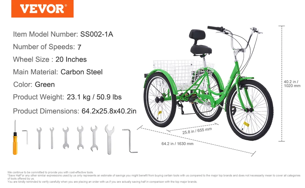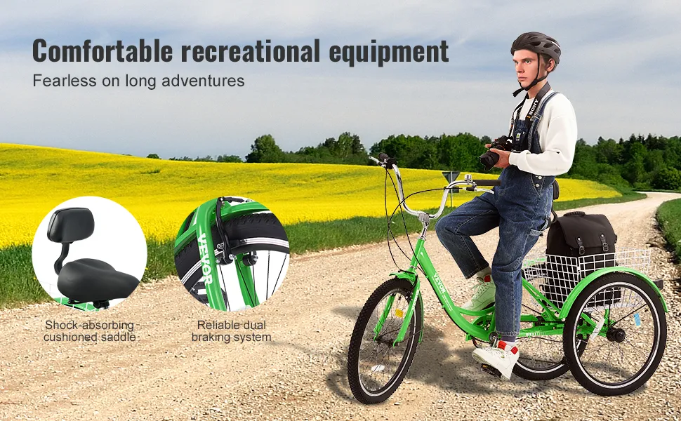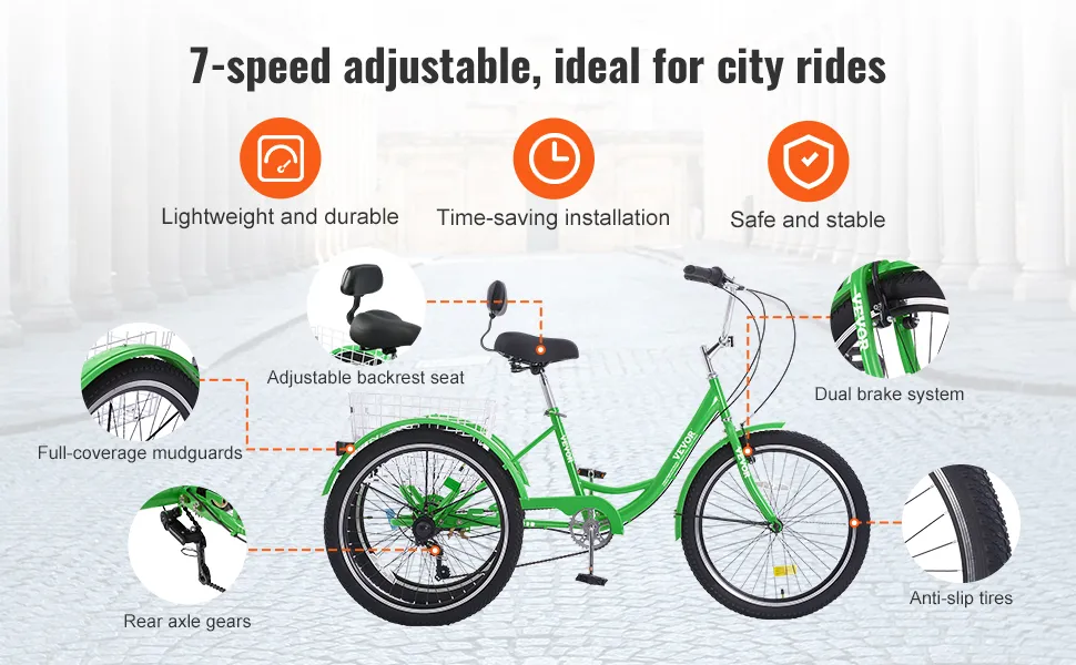 VEVOR Triciclos para adultos, 7 velocidades, 20 pulgadas, de acero al carbono, con cesta y asiento ajustable, ideal para picnics, compras, para personas mayores, mujeres y hombres (verde)