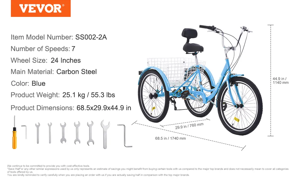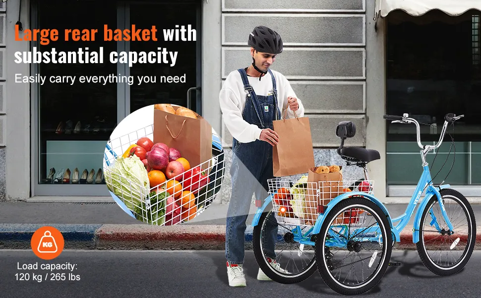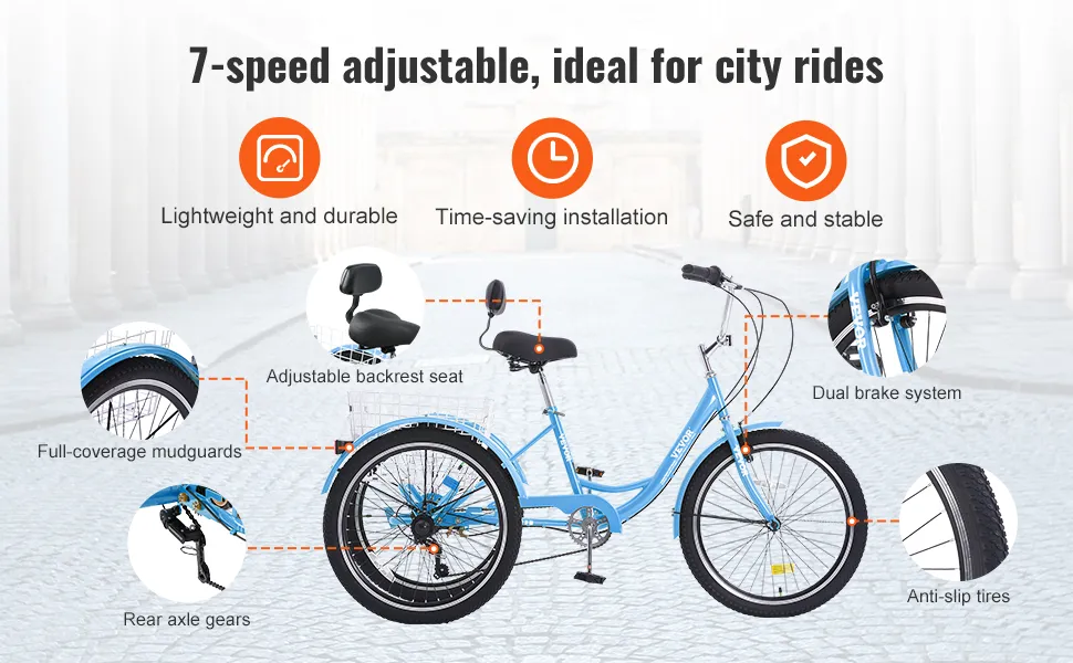 VEVOR Triciclos para adultos, 7 velocidades, 24 pulgadas, de acero al carbono, con cesta y asiento ajustable, ideal para picnics, compras, para personas mayores, mujeres y hombres (azul)