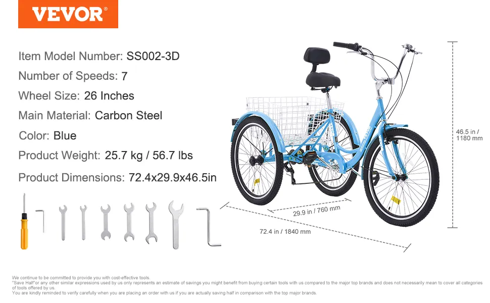 Opciones de tamaño múltiple: Disponible en varios tamaños y colores. Altura de 4'8" a 5'6" adecuada para ruedas de 20"; altura de 4'11" a 5'10" adecuada para ruedas de 24"; altura de 5'3" a 6'2" adecuada para ruedas de 26". Elija según su situación real. El triciclo para adultos viene con un manual en color y herramientas de montaje, etc. Puede realizar su compra con confianza.