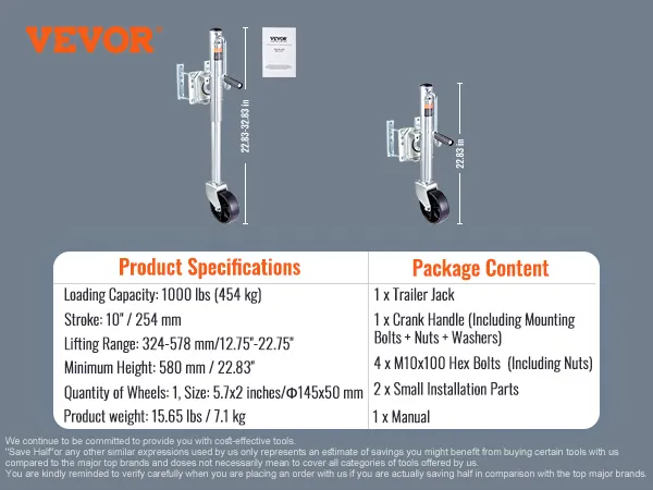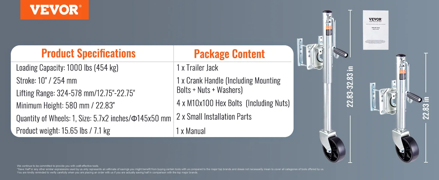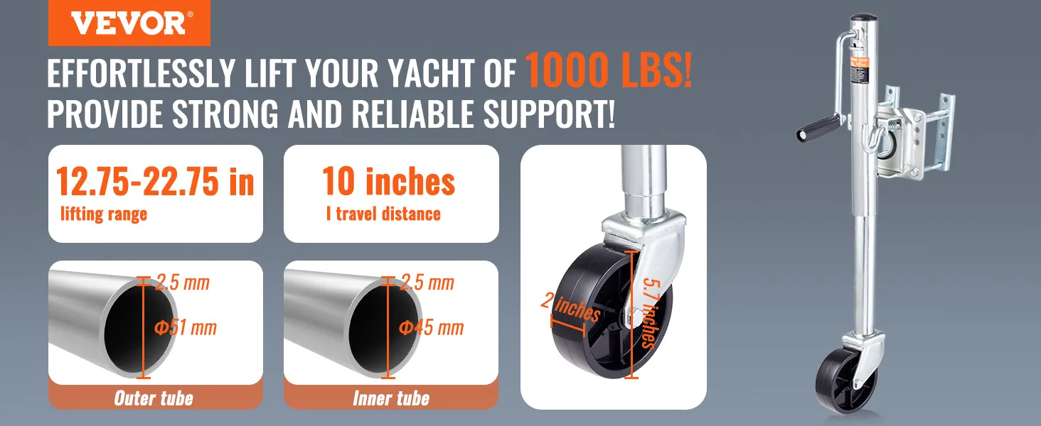 Capacidad de carga de servicio pesado: el gato para remolque VEVOR cuenta con una impresionante capacidad de elevación de 1000 libras, lo que lo convierte en una poderosa herramienta para tareas de elevación. Con un rango de elevación de 12,75 a 22,75 pulgadas, se adapta a remolques de alto o bajo perfil sin importar.