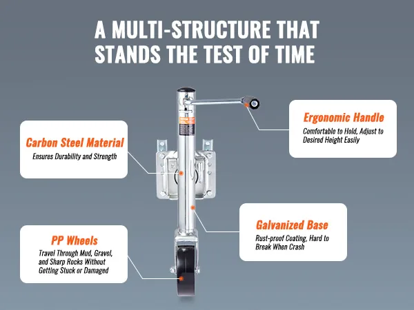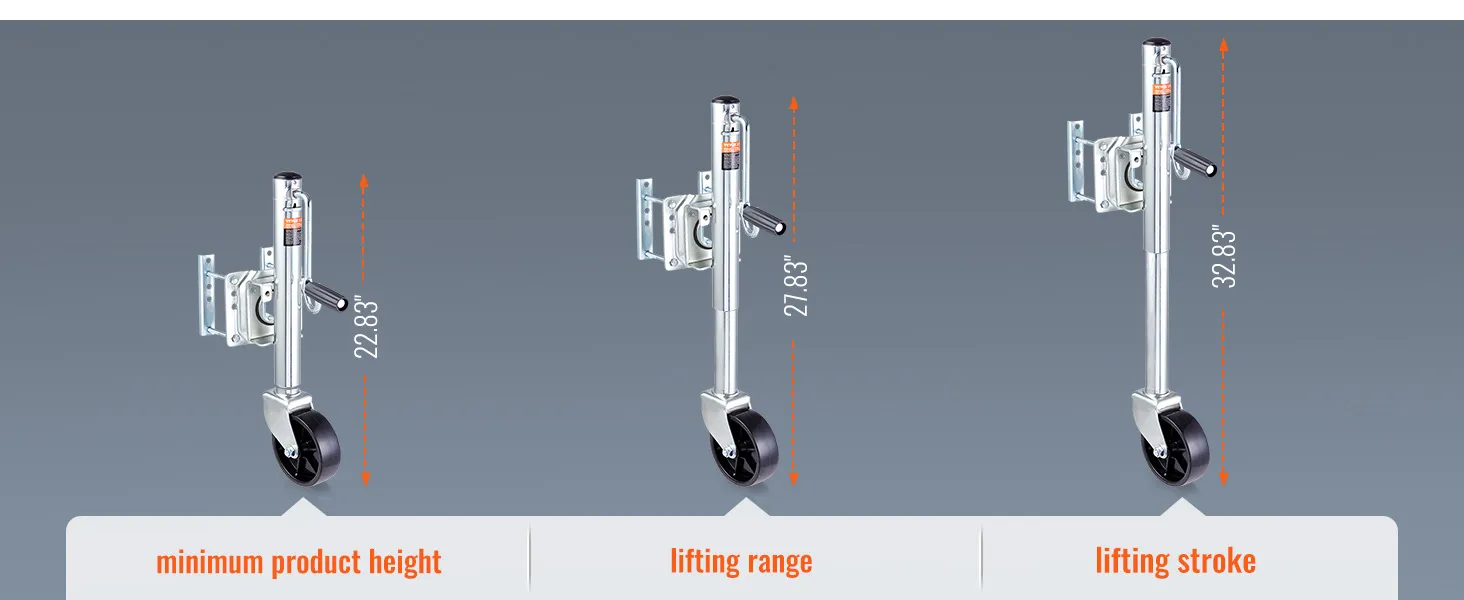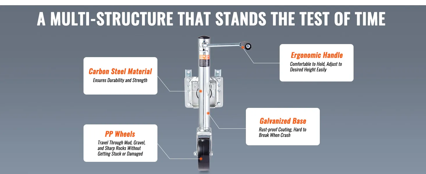 Diseñado para estabilidad y durabilidad: este soporte de gato para remolque está diseñado para brindar una estabilidad excepcional y un rendimiento duradero. Fabricado en acero al carbono de alta resistencia, ofrece la máxima resistencia y rigidez. Los tubos interior y exterior galvanizados y el acabado en polvo proporcionan una mayor resistencia a la corrosión.