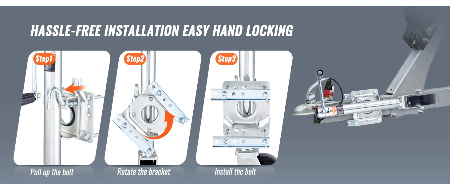¡Proporcione todos los accesorios necesarios para la instalación! La instalación es rápida y simple, puede tener el gato del remolque del barco en funcionamiento en muy poco tiempo.