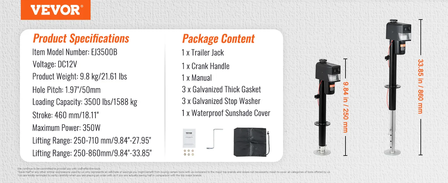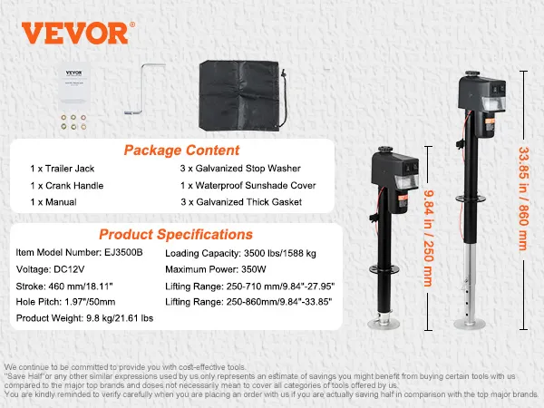 Gato eléctrico para remolque VEVOR, con capacidad de 1587 kg (3500 lb), de 25 a 85 cm (9.84 a 33.85 pulgadas) y cubierta impermeable para levantar remolques de autocaravanas, remolques para caballos, remolques utilitarios y remolques para yates.