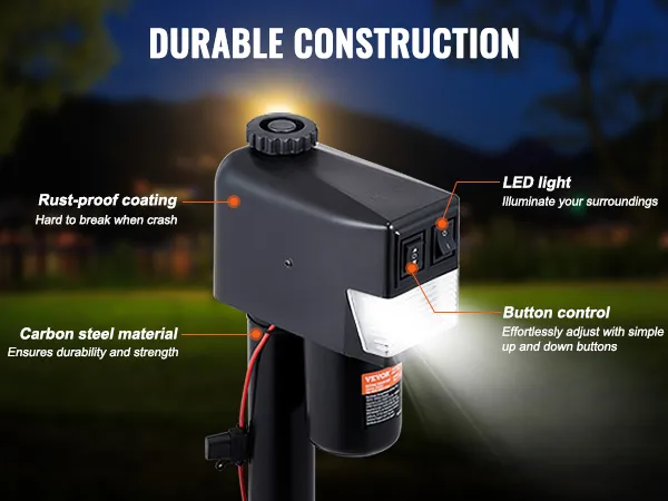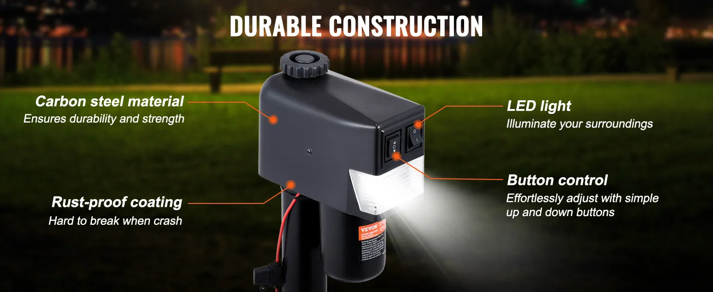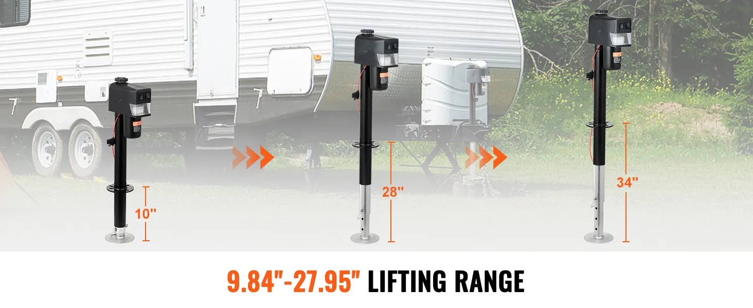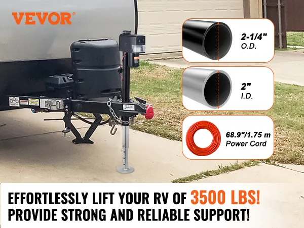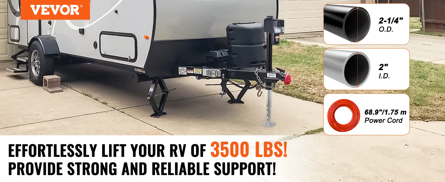 Gato de remolque eléctrico VEVOR con una capacidad de carga de hasta 3500 lbs. Fabricado con acero al carbono duradero con un revestimiento a prueba de herrumbre, este gato eléctrico para vehículos recreativos garantiza un rendimiento duradero incluso en condiciones adversas. Adecuado para remolques de yates, remolques de vehículos recreativos, remolques de caballos y remolques utilitarios.