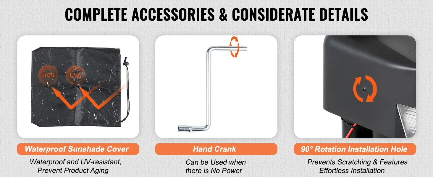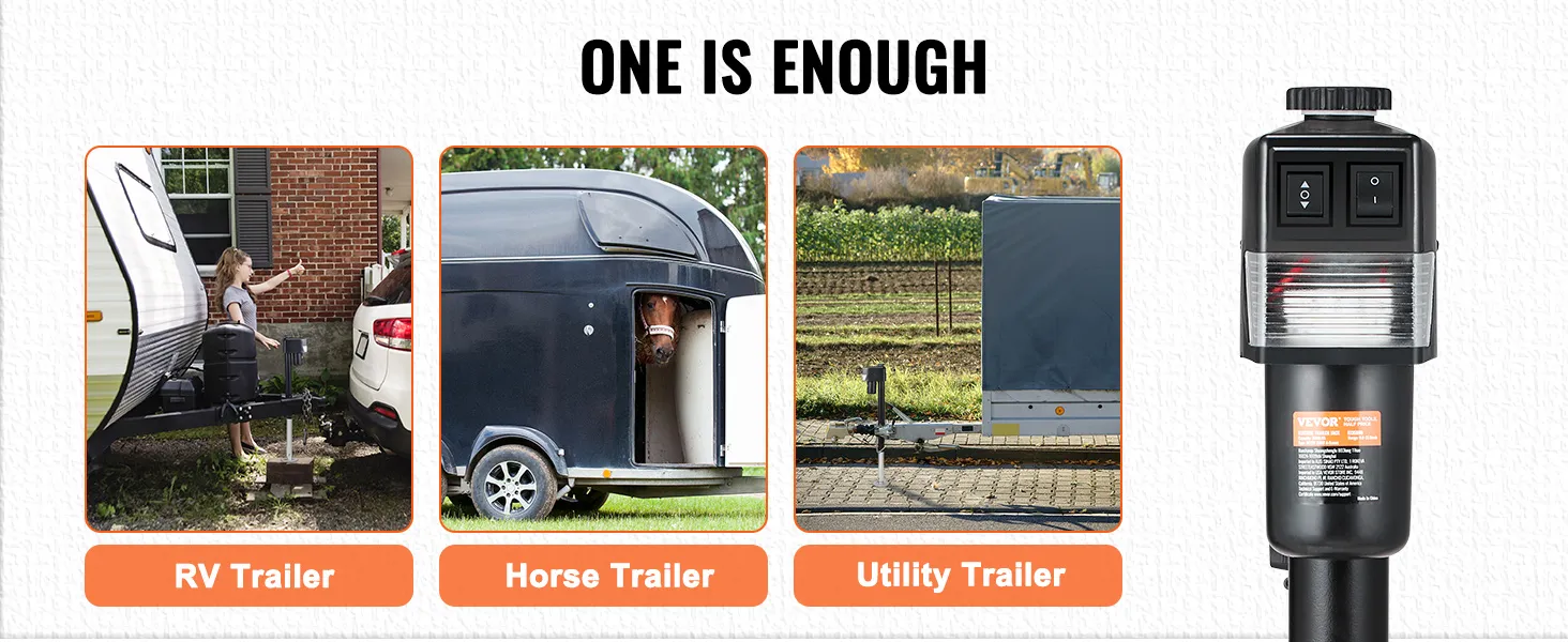 Aplicación versátil: este gato eléctrico para remolque es perfecto para una amplia gama de aplicaciones. Ya sea que esté levantando remolques de vehículos recreativos, remolques para caballos o remolques utilitarios, proporciona la fuerza y la estabilidad que necesita para remolcar sin esfuerzo. En caso de corte de energía, el gato eléctrico para remolques está equipado con una manivela para uso de emergencia.