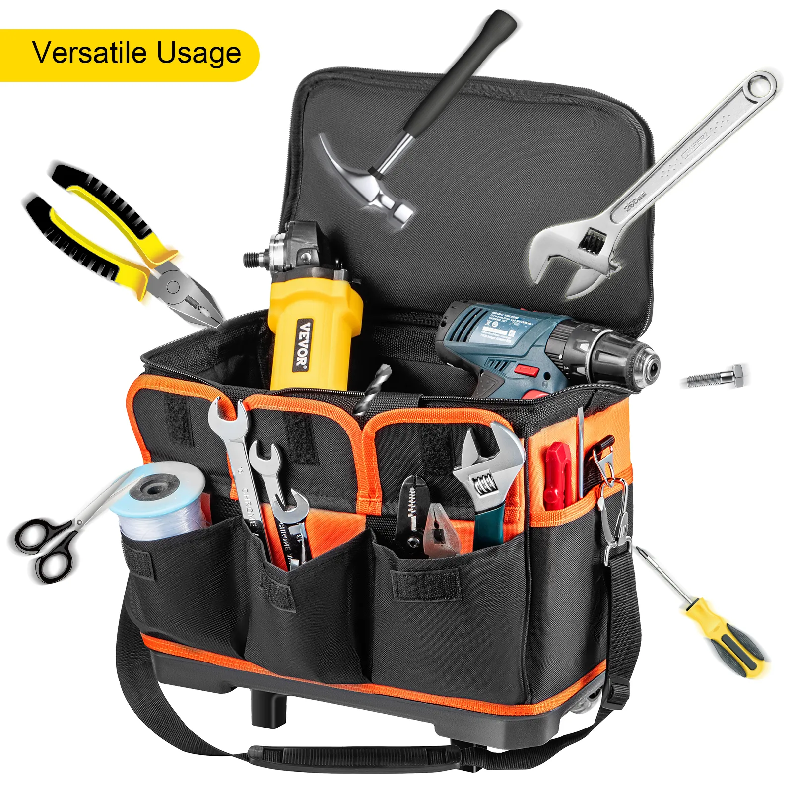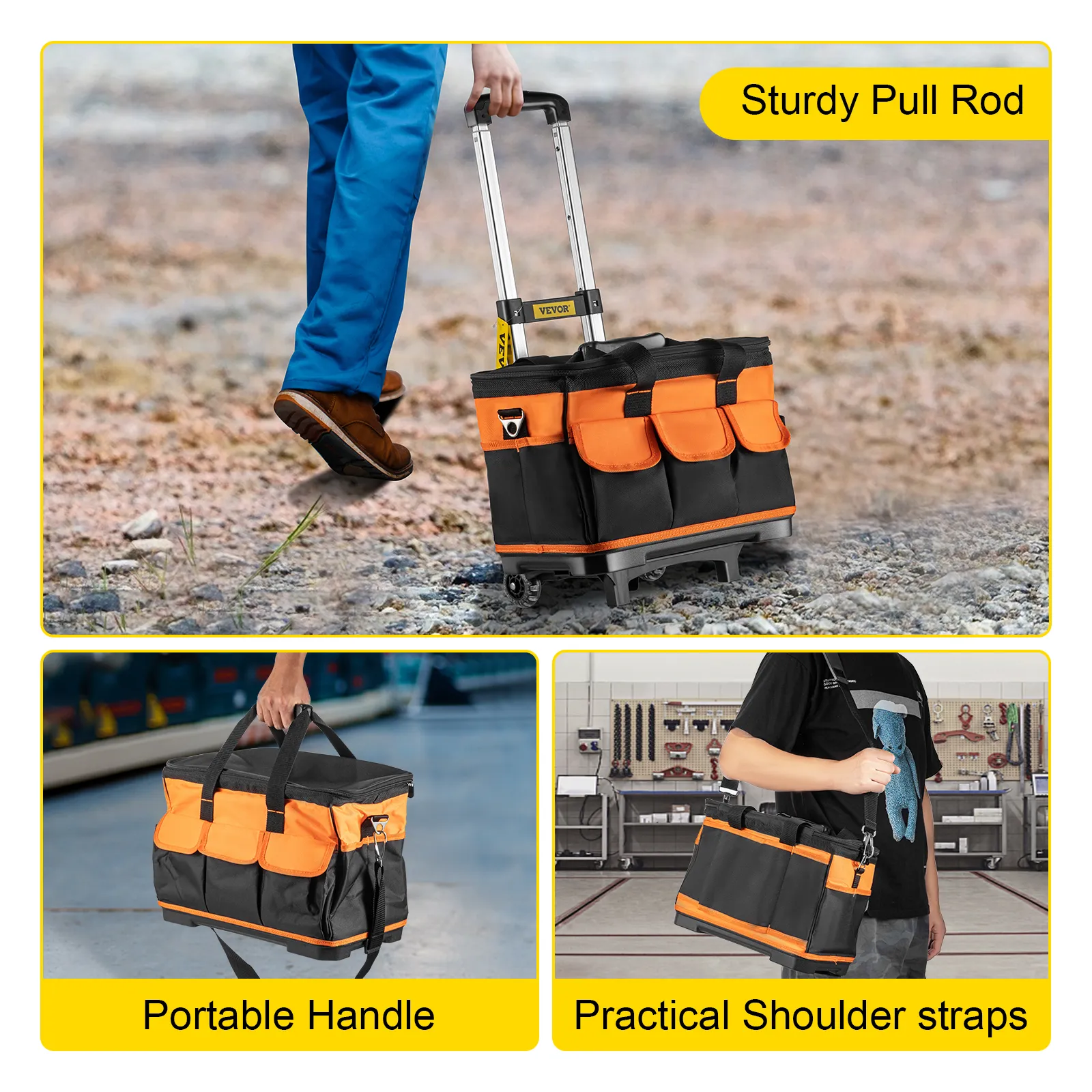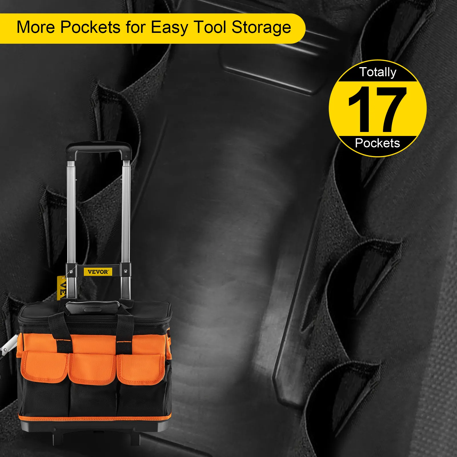 Nuestra bolsa de herramientas tiene 17 bolsillos para guardar sus herramientas manuales favoritas. Este organizador de bolsas de herramientas es la herramienta perfecta para ahorrarle el viaje cuando necesite sus herramientas. Los grandes compartimentos principales brindan abundante espacio de almacenamiento para herramientas y equipos eléctricos compactos. Además, está equipado con un asa telescópica resistente y ruedas que permiten una fácil movilidad.
