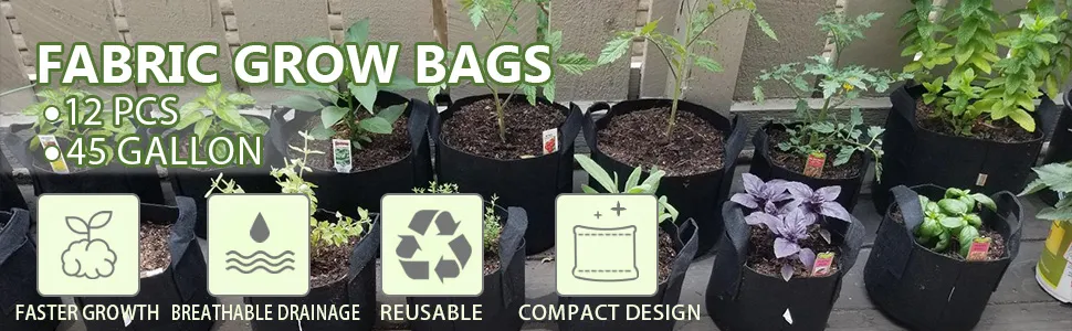 Este paquete de 12 bolsas de cultivo de plantas de 45 galones son macetas de tela de aireación lavables y reutilizables con asas, ofrece una alternativa más saludable, más inteligente y más versátil a los contenedores de jardinería tradicionales de arcilla o plástico.