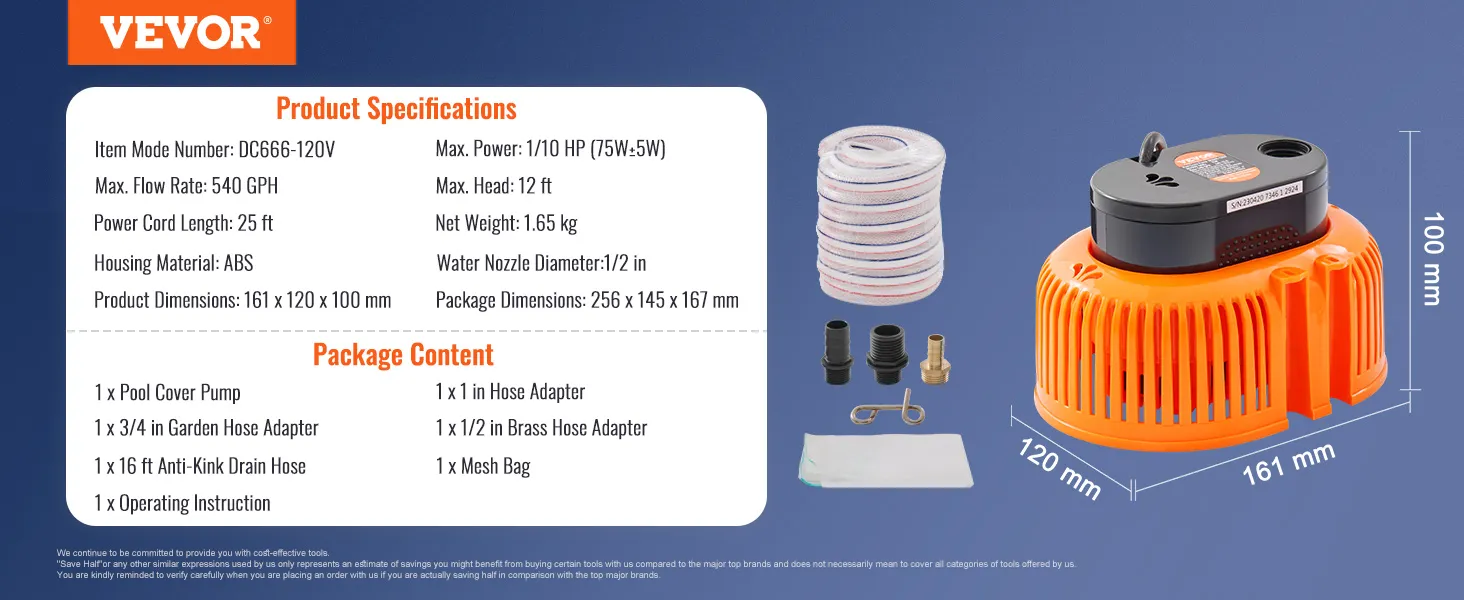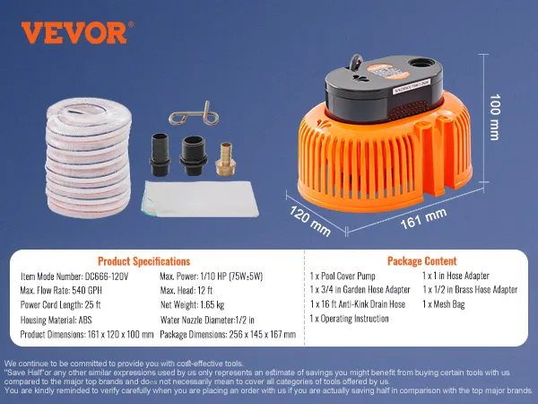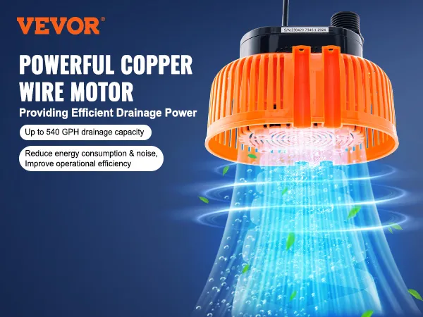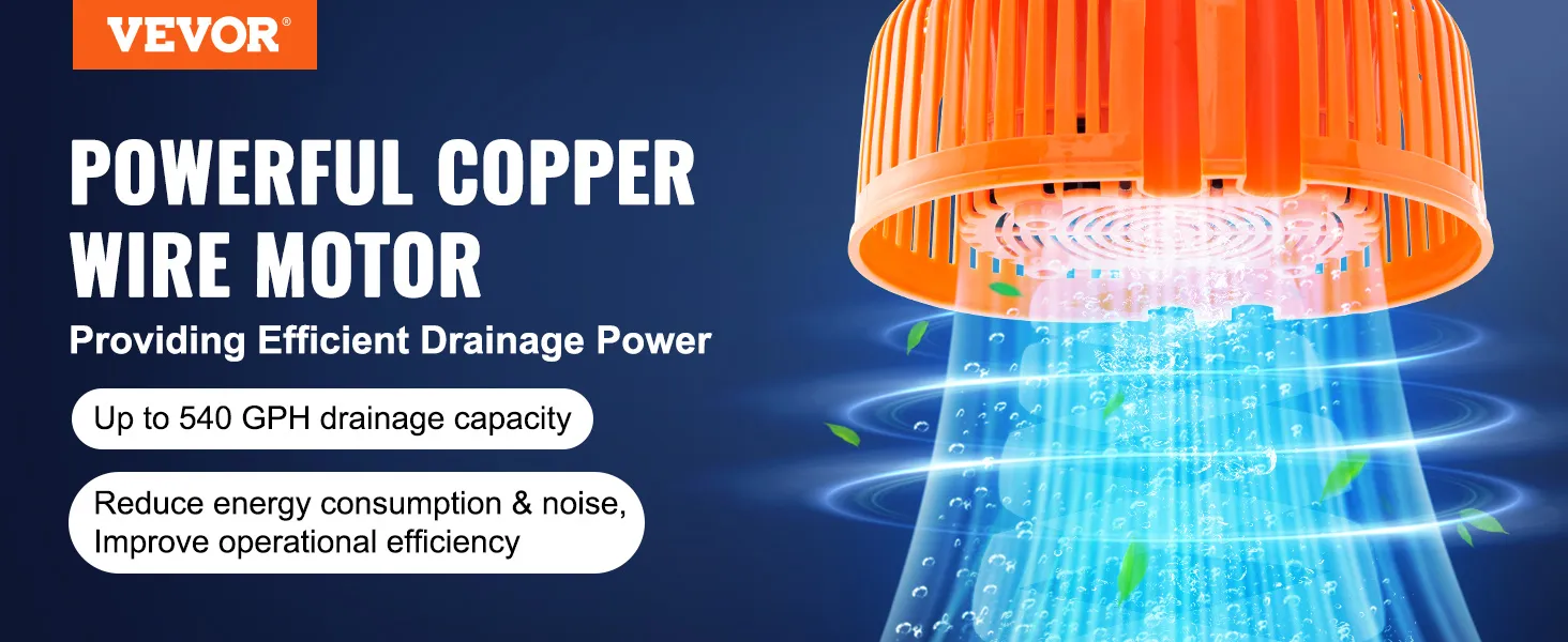 Drenaje eficiente: la bomba para cubierta de piscina utiliza un potente motor de alambre de cobre, lo que le permite bombear hasta 540 galones por hora, lo que reduce significativamente el tiempo necesario para el drenaje del agua. También reduce el consumo de energía y el ruido al tiempo que mejora la eficiencia operativa, lo que le permite completar las tareas de drenaje de forma más fácil y rápida.