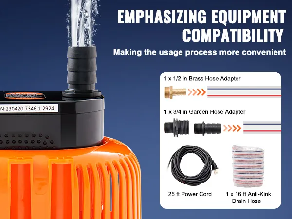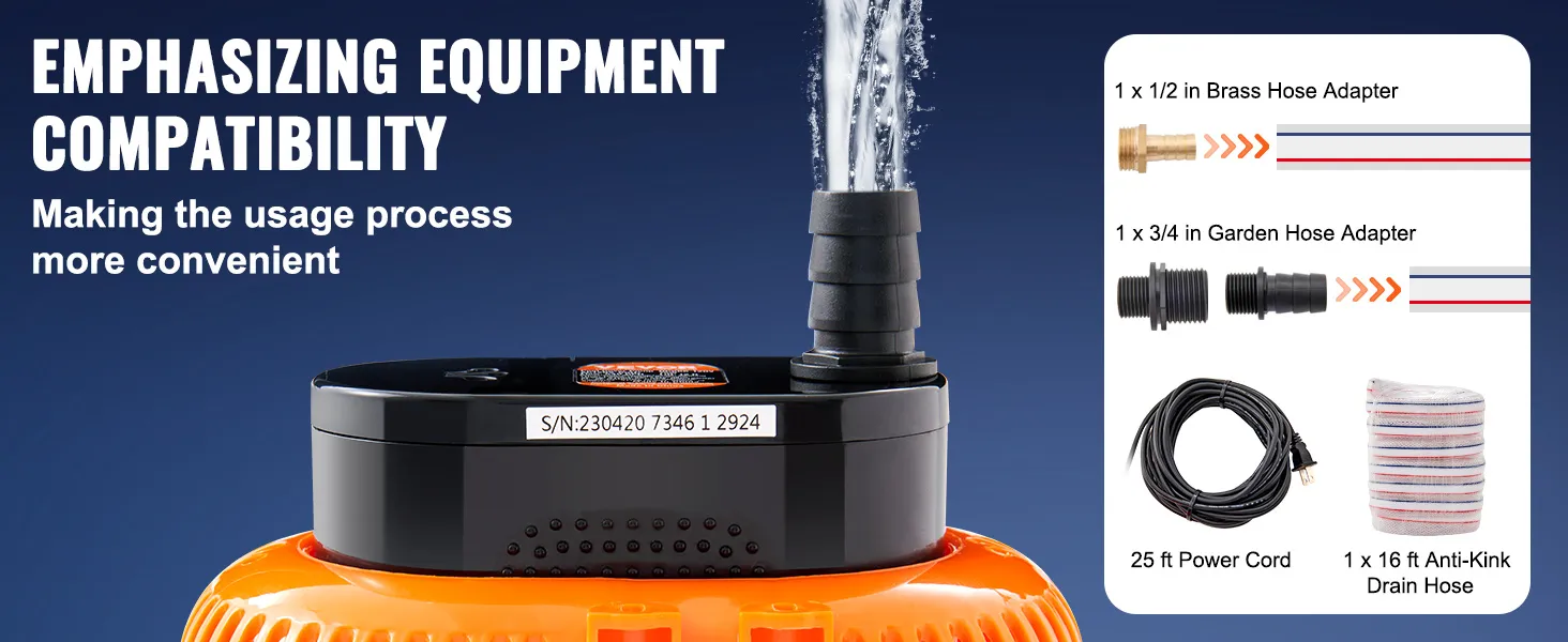 Proporcionamos un adaptador de manguera de 1 pulgada, un adaptador de manguera de jardín de 3/4 de pulgada y un adaptador de manguera de latón de 1/2 pulgada, así como un cable de alimentación de 25 pies para manejar cualquier necesidad de drenaje fácilmente.