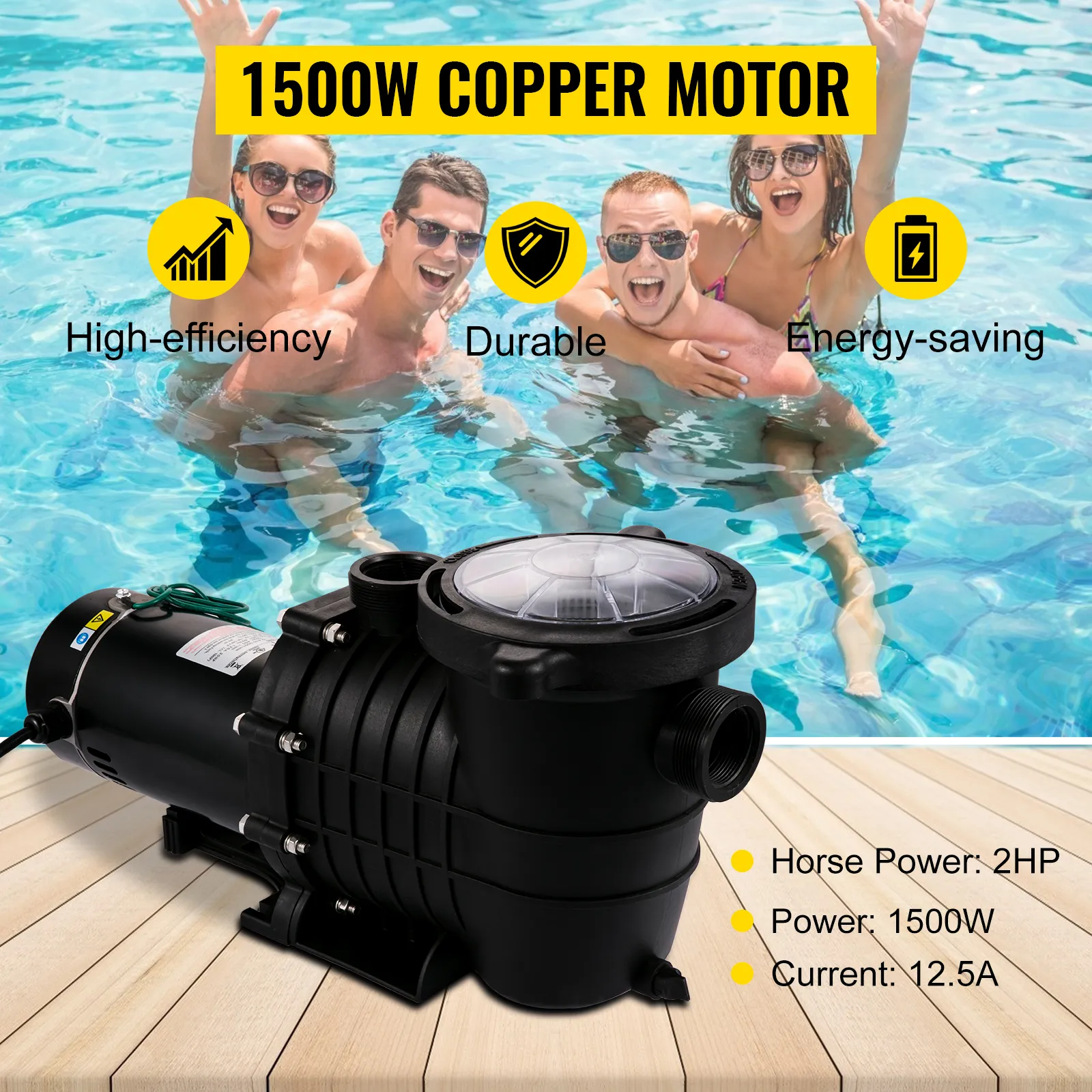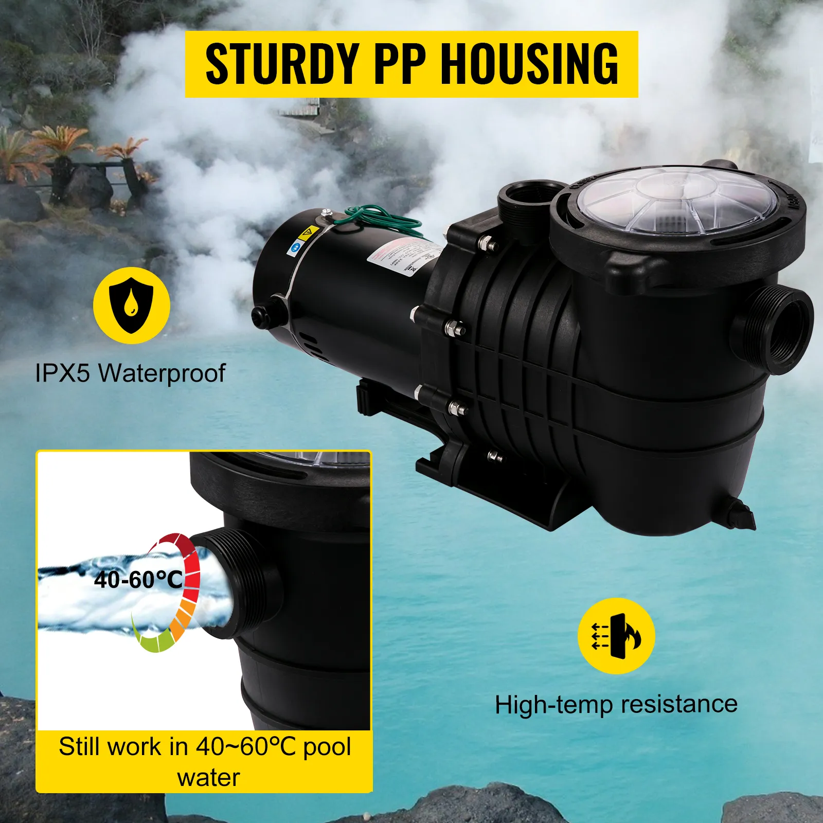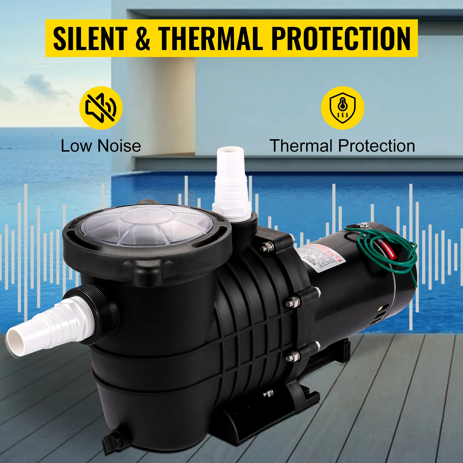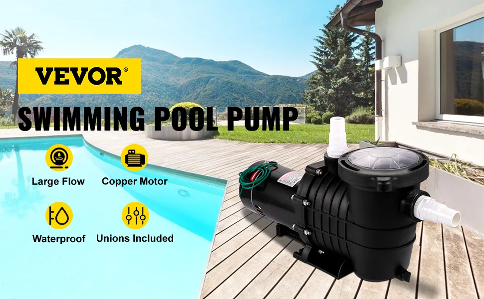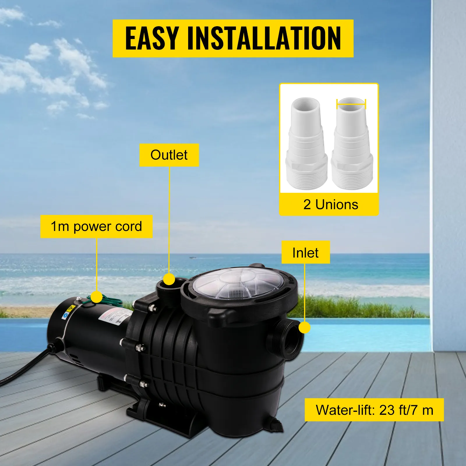 La bomba de piscina adopta una carcasa de PP resistente y agua de cobre de 2 HP, y funciona de manera silenciosa y estable con un caudal máximo de 6657 GPH. Se incluyen dos uniones NP de 1-1/2" para una fácil instalación. La canasta del colador puede filtrar eficazmente los desechos en el agua. Usted y su familia se divertirán con agua fresca, clara y refrescante este verano con la ayuda de la bomba.