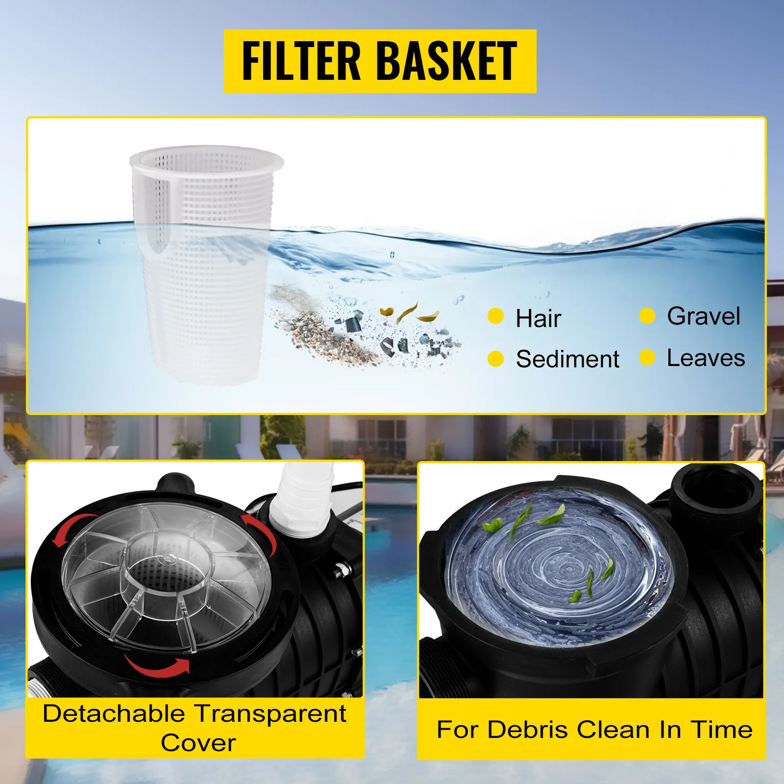 La bomba de piscina está equipada con una canasta de filtro, que puede filtrar desechos grandes, como grava, hojas, basura, etc. Además, la cubierta transparente le permite observar los detalles en el interior y limpiar los desechos a tiempo.