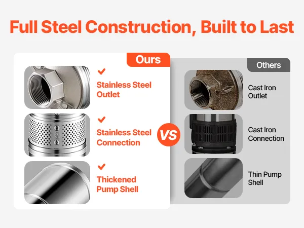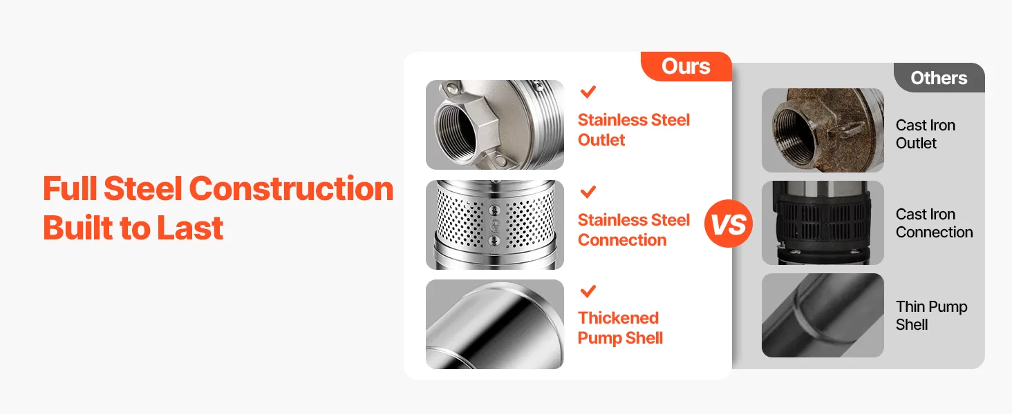 Built to Last, Corrosion-Resistant: Designed for durability, our deep well submersible pump boasts an IP68 waterproof rating and is crafted with stainless steel stainless steel connection and filtration mesh. This corrosion-resistant construction resists rust and keeps debris out, effectively protecting the motor.