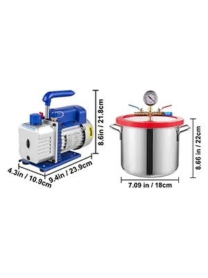 - Esta bomba de vacío de 3,6 CFM con cámara de vacío de alta capacidad de 1,5 galones es perfecta para eliminar los gases de los compuestos que han quedado atrapados en la mezcla al mezclar los componentes, con un ventilador de refrigeración integrado de alta capacidad, una junta de silicona duradera, un indicador lleno de glicerina, etc. Y este kit también es adecuado para aire acondicionado doméstico, mantenimiento de automóviles, envasado al vacío, vacío de refrigeradores e industria.