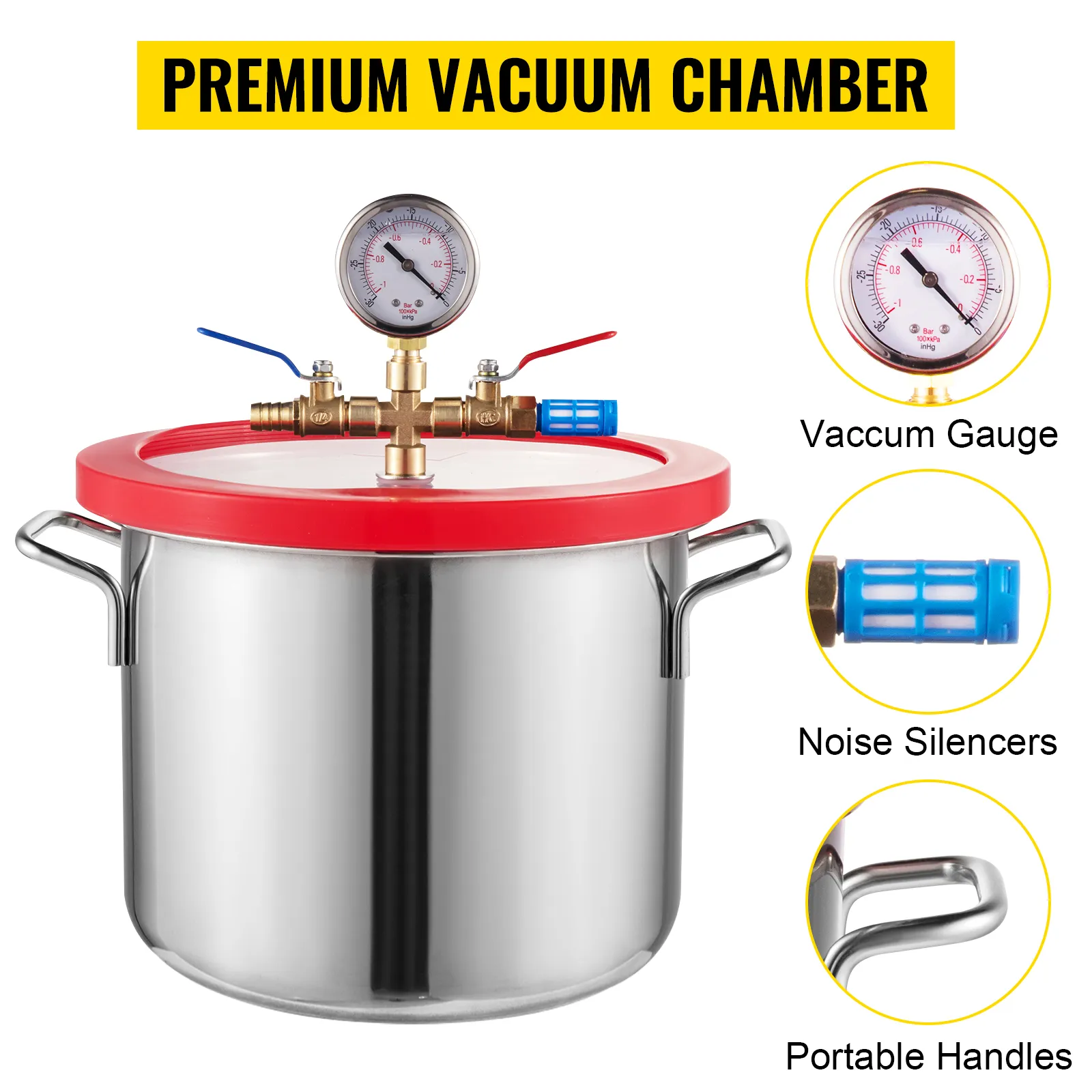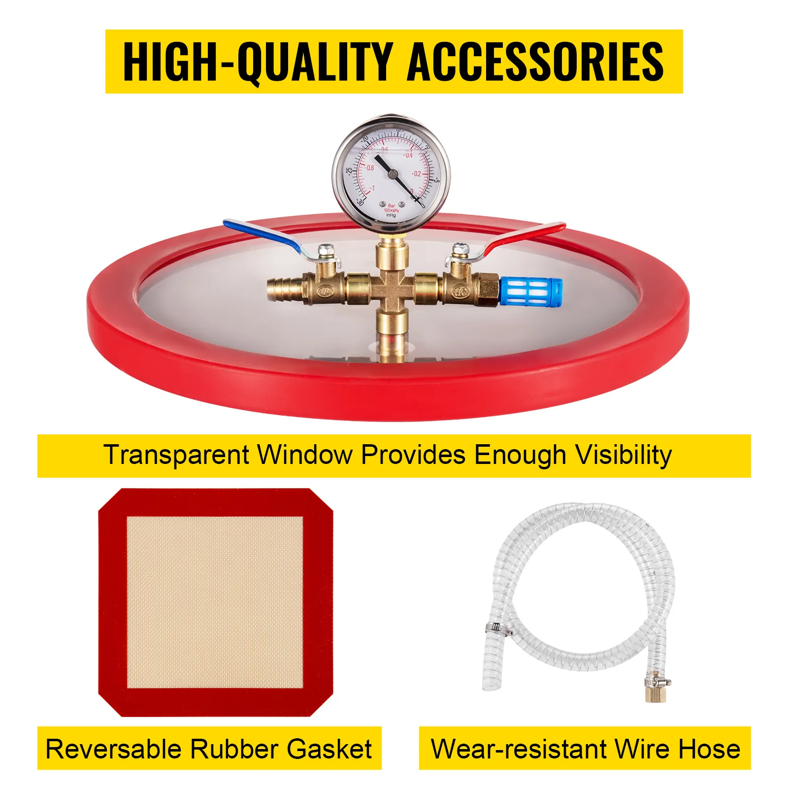 La tapa de cristal acrílico a prueba de balas te ayuda a ver el interior con claridad. Y la junta de vacío volteable de dos lados para una mayor durabilidad y confiabilidad. Los accesorios duraderos de latón en la cámara se adaptan a todos los puertos de la bomba de vacío. Alambre de acero integrado, la manguera es más duradera.