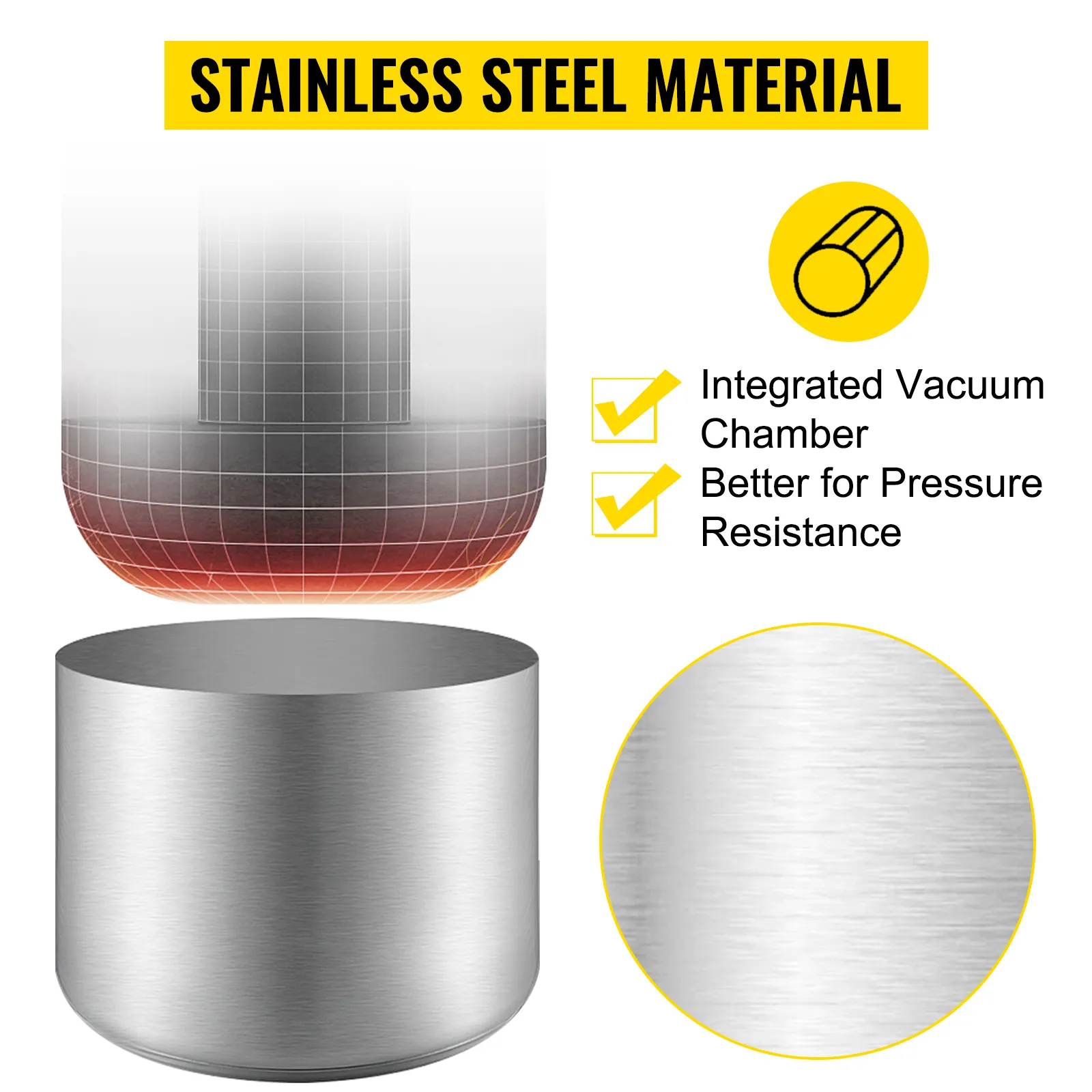 Esta cámara de vacío está hecha de acero inoxidable de alta resistencia con moldeado de una sola pieza, muy duradero y puede soportar hasta 160ºF, manteniendo el vacío durante mucho tiempo. Admite un nivel de vacío de hasta 29,9" Hg.