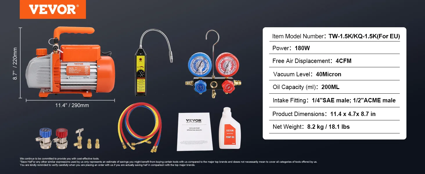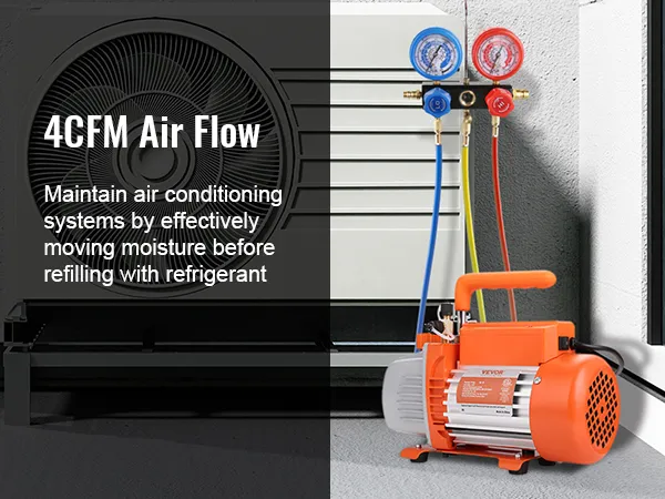 El kit de bomba de vacío VEVOR auto ac está diseñado para medir la presión en equipos de refrigeración y extraer gas para obtener un vacío, cumpliendo con altos estándares de vacío. Adecuado para mantenimiento de HVAC y mantenimiento de refrigeración automotriz.