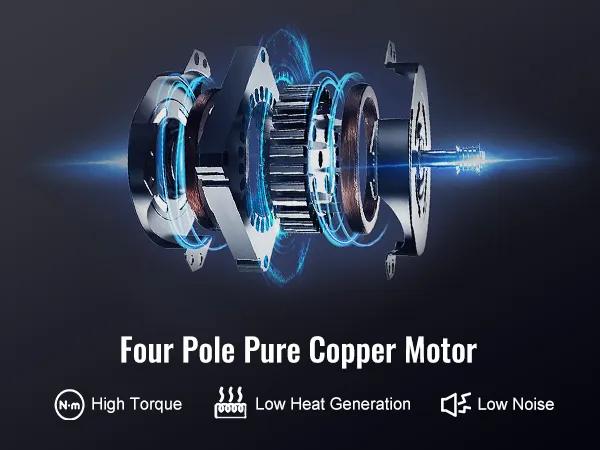 Motor de cobre puro de 4 polos: el motor tiene un alto par para un funcionamiento más eficiente. El disipador de calor en forma de T y el ventilador de enfriamiento ayudan al motor de cobre puro a disipar el calor de manera efectiva, lo que le permite funcionar continuamente durante más de 2 horas. Y con protección adicional contra sobrecalentamiento, puede disfrutar de un rendimiento estabilizado y una vida útil más larga para su motor.