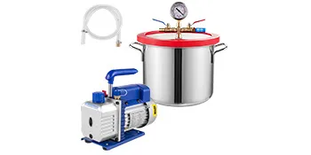 - Esta bomba de vacío de 2,5 CFM con cámara de vacío de alta capacidad de 1,5 galones es perfecta para eliminar los gases de los compuestos que han quedado atrapados en la mezcla al mezclar los componentes, con un ventilador de refrigeración integrado de alta capacidad, una junta de silicona duradera, un indicador lleno de glicerina, etc. Y también es adecuado para el aire acondicionado doméstico, el mantenimiento de automóviles, el envasado al vacío, el vacío del refrigerador, la industria, etc.