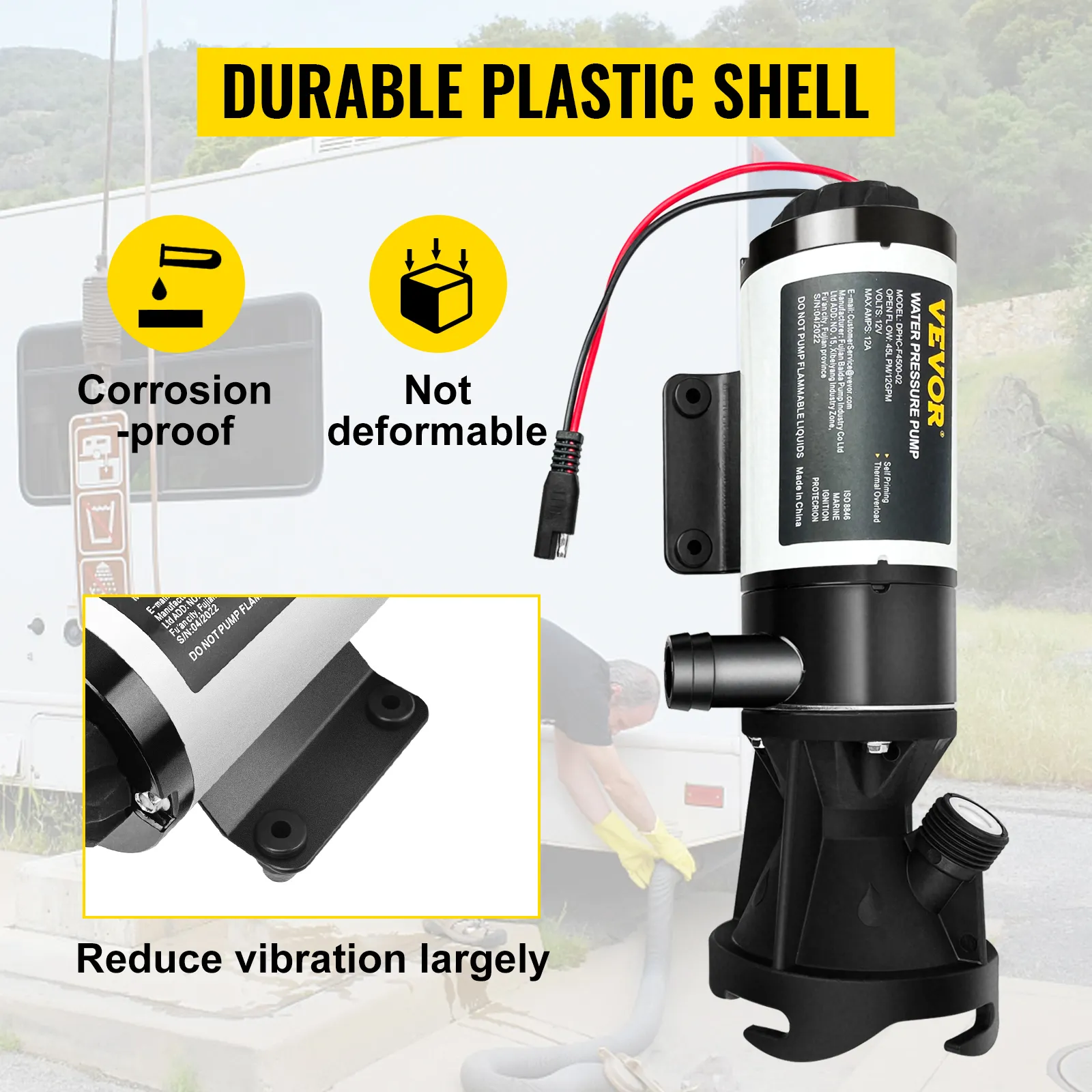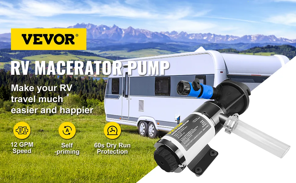 Autocebado de 12 GPM: Voltaje: 12V. Nuestra bomba maceradora RV tiene un motor de cobre puro mejorado para aumentar su caudal a 12 GPM y su altura máxima de elevación a 16 pies. La función de protección contra sobrecarga térmica resuelve perfectamente sus preocupaciones sobre la seguridad. Además, hay un botón giratorio para controlar el flujo de agua dentro y fuera.