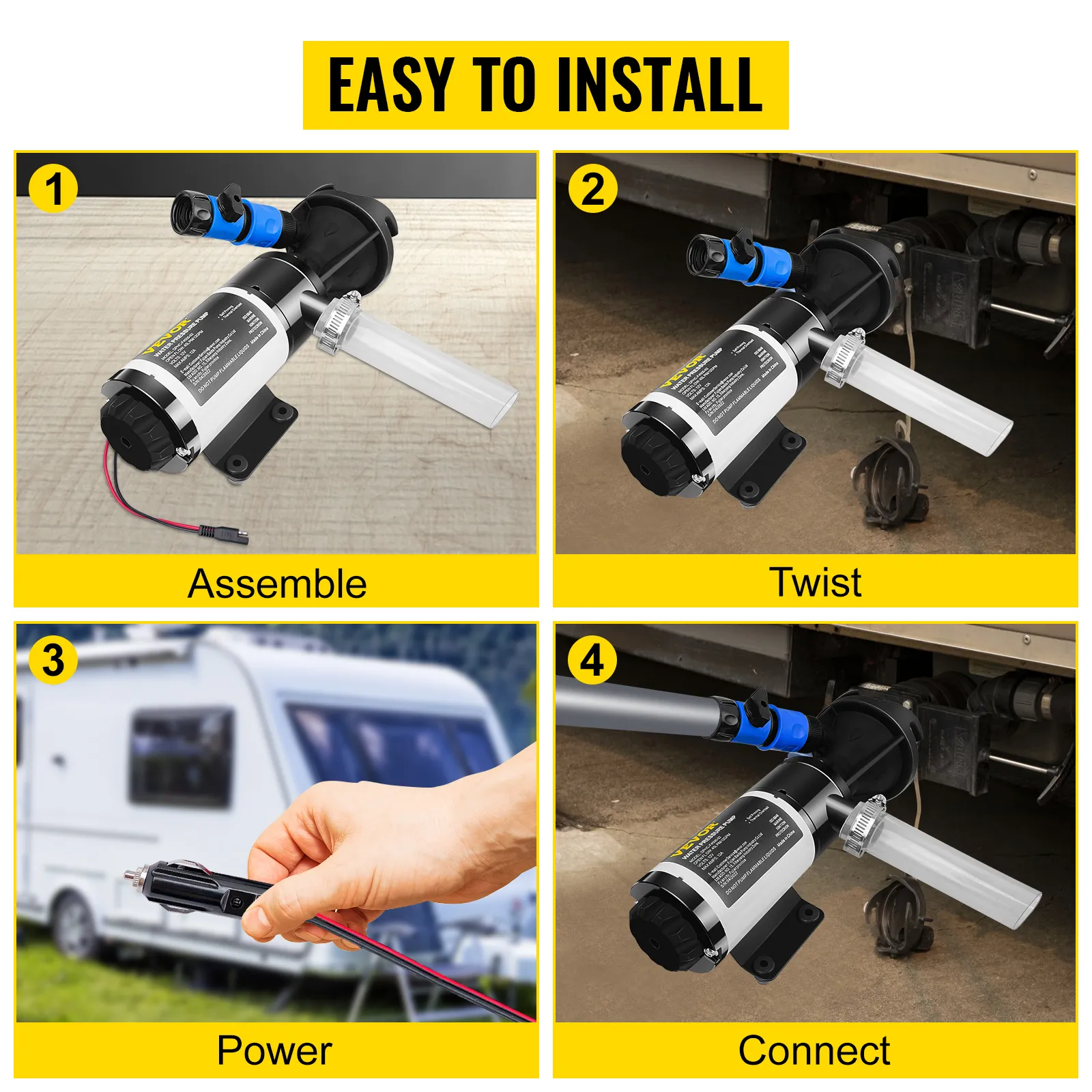 El proceso de instalación es muy simple y fácil para profesionales y principiantes. También puede desmontar sin esfuerzo este macerador de bomba de residuos de RV incluso si no es un experto.