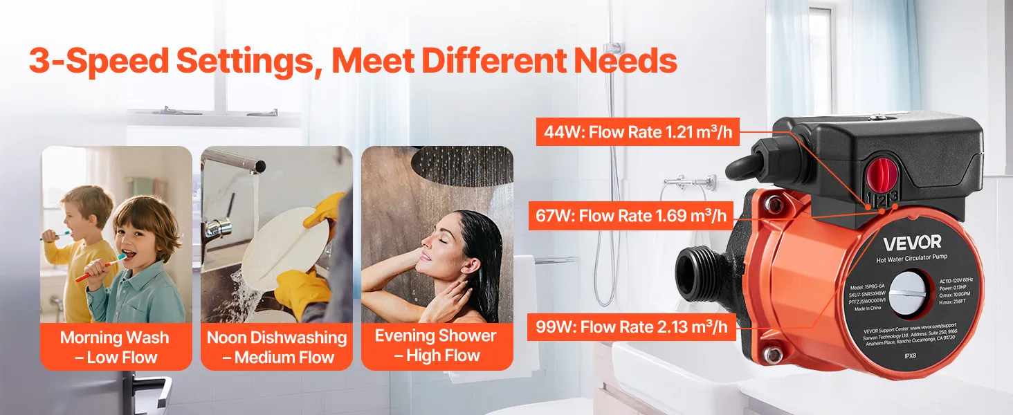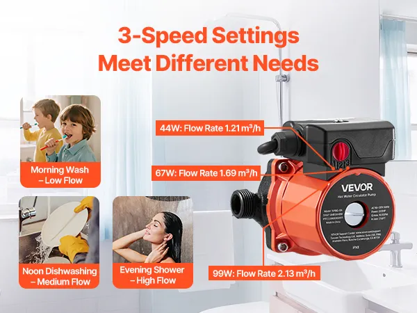 3-Speed Control: Features three customizable speed settings with flow rates of 2.13/1.69/1.21 m³/h and power of 99W/67W/44W. Whether you need maximum performance or energy savings, this hot water circulation pump adapts to your needs