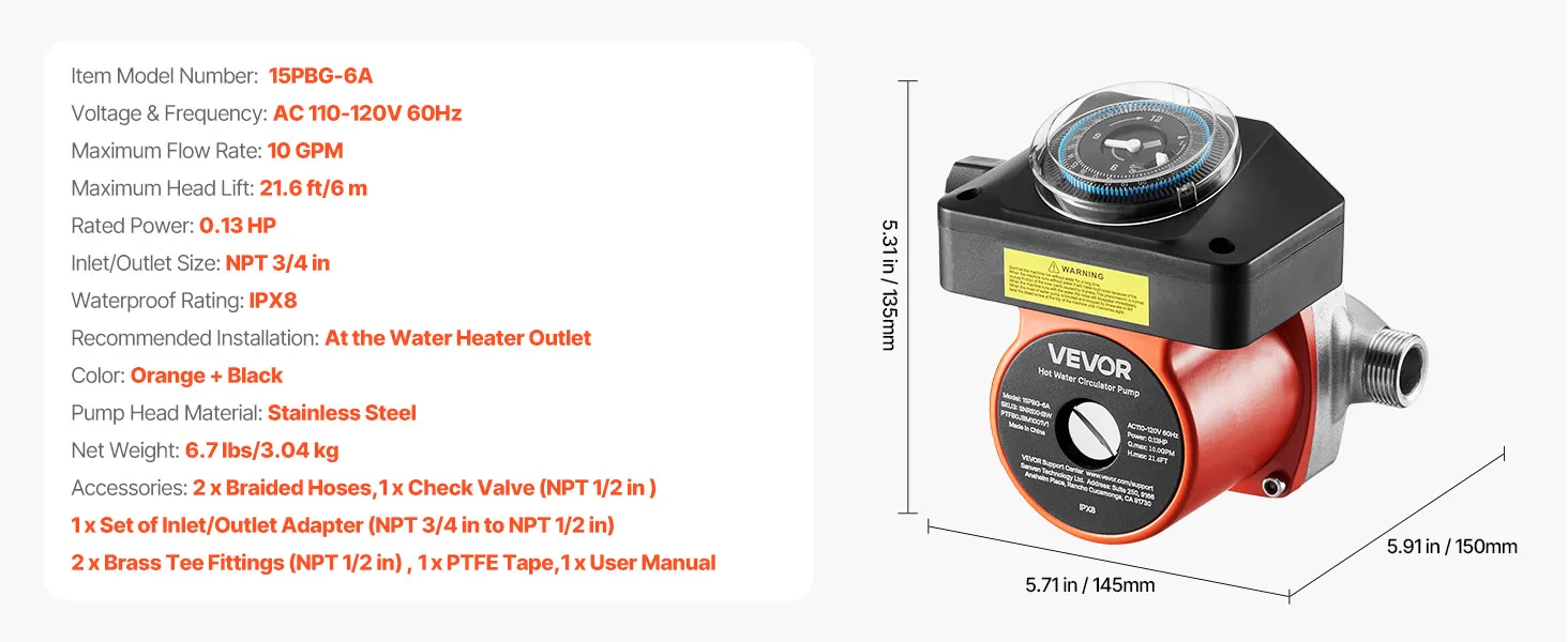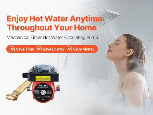 Agua caliente instantánea: Ofrece un caudal máximo de 10 GPM y una altura de elevación de 21.6 pies. Este kit de bomba de recirculación garantiza una rápida circulación del agua caliente. La válvula de derivación integrada mantiene el agua fluyendo eficientemente y se apaga automáticamente al alcanzar la temperatura adecuada.