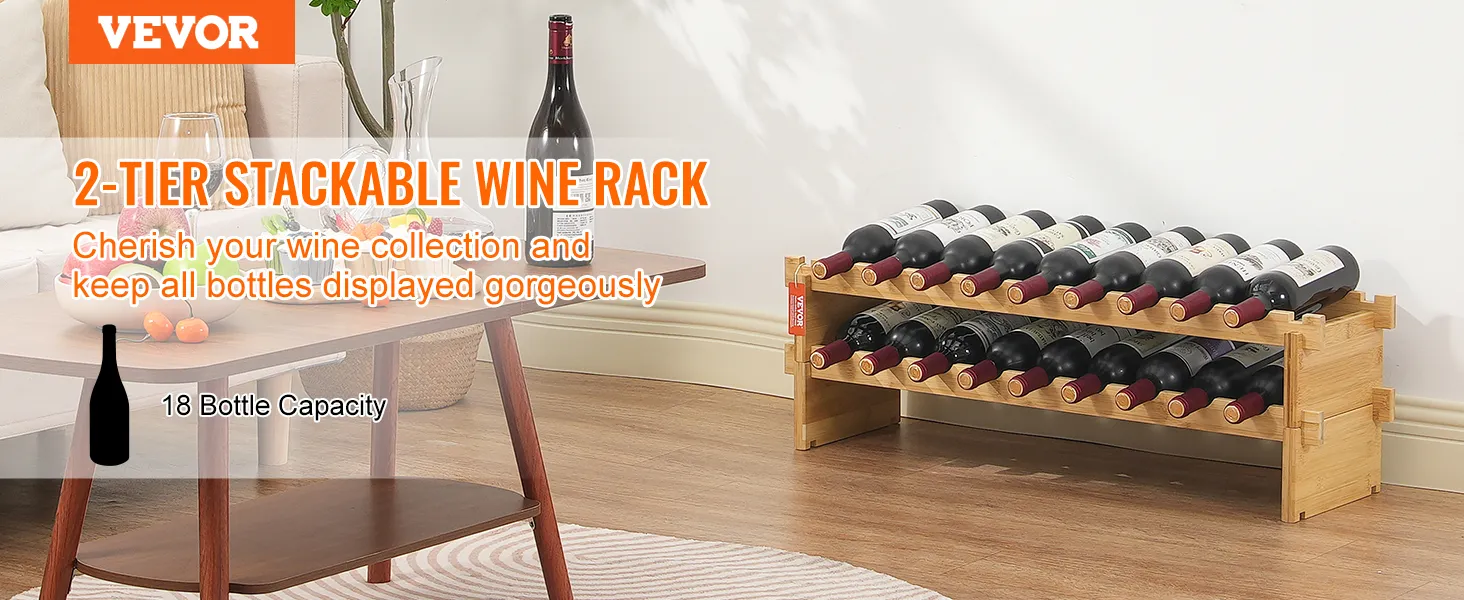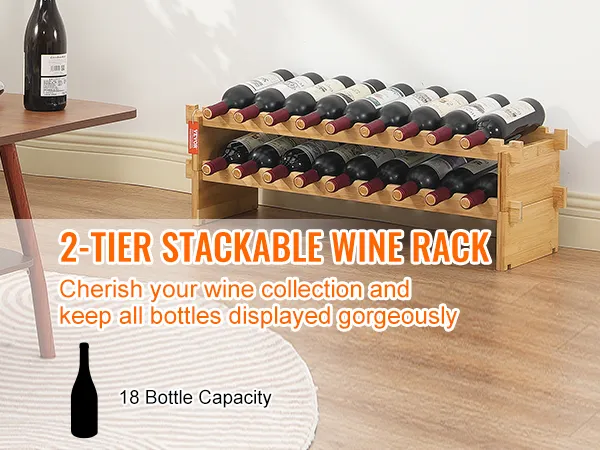 VEVOR - Botellero modular apilable para 18 botellas, de madera maciza de bambú de 2 niveles, para vino, expositor independiente, para cocina, bar y bodega (color natural)