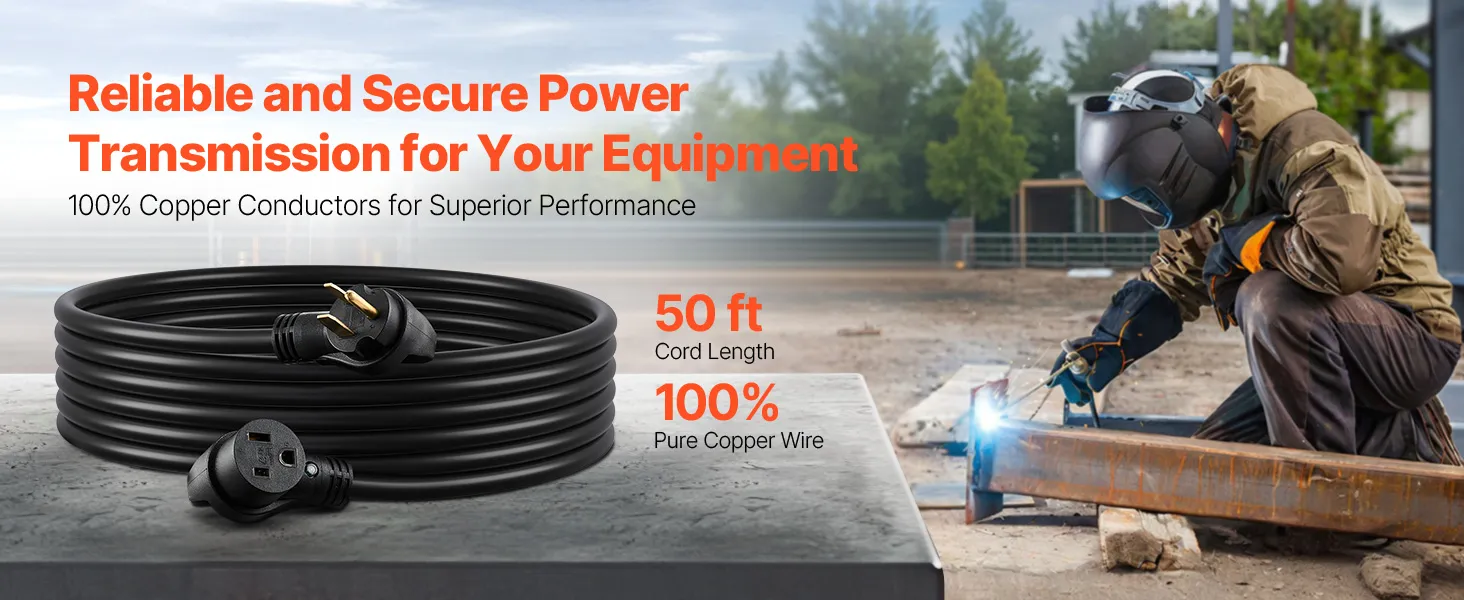 50FT Power Cord: The 50FT length generator cord is suitable for long-distance operation. It is suitable for connecting the campground or park power to your electric welding machine.