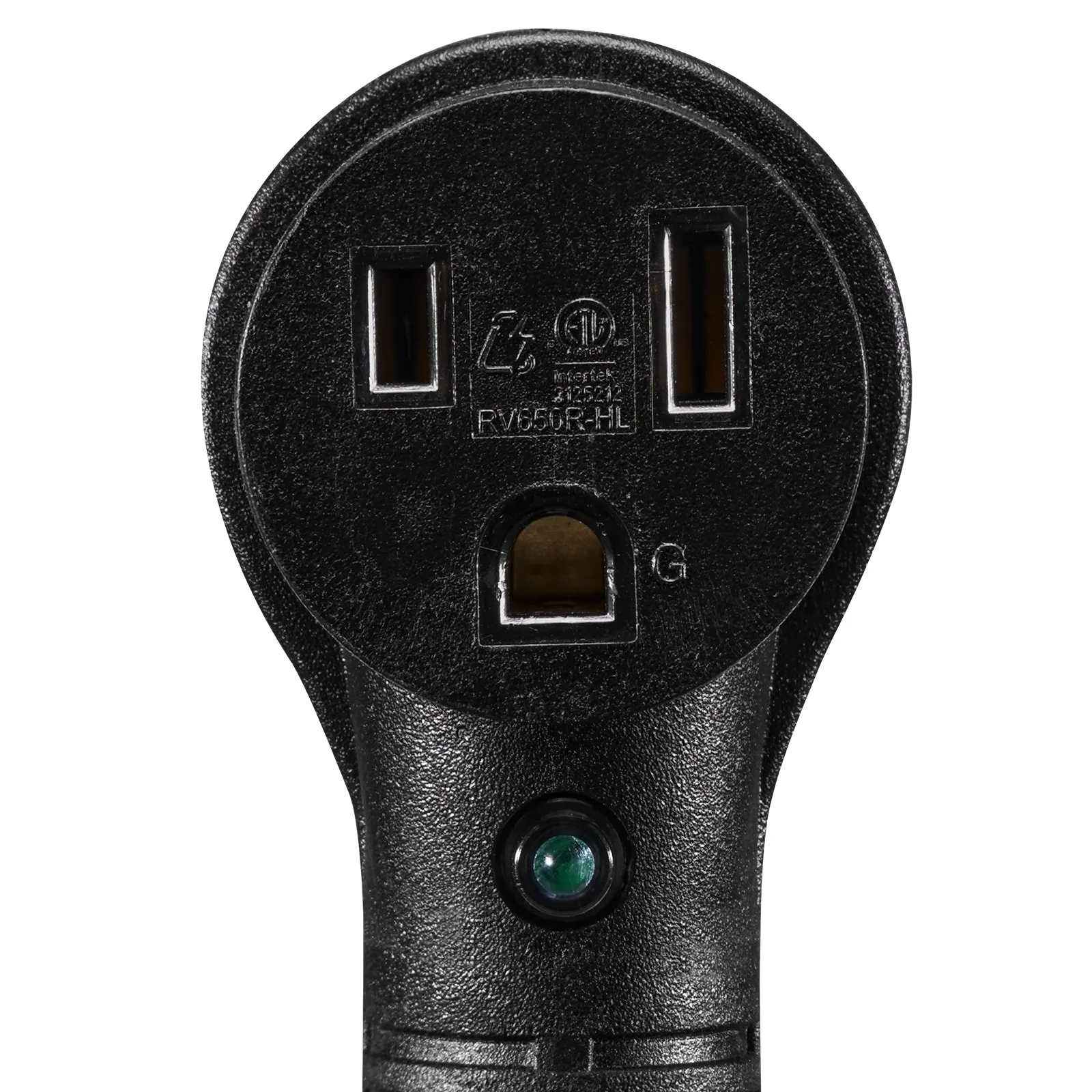 The cord has a configuration of 250 volts with a max rating of 7500 watts. With these traits, our locking power cord allows you to connect the campground or park power to your RV, Motorhome, Trailer, or vehicle with a built-in N6-50R inlet.