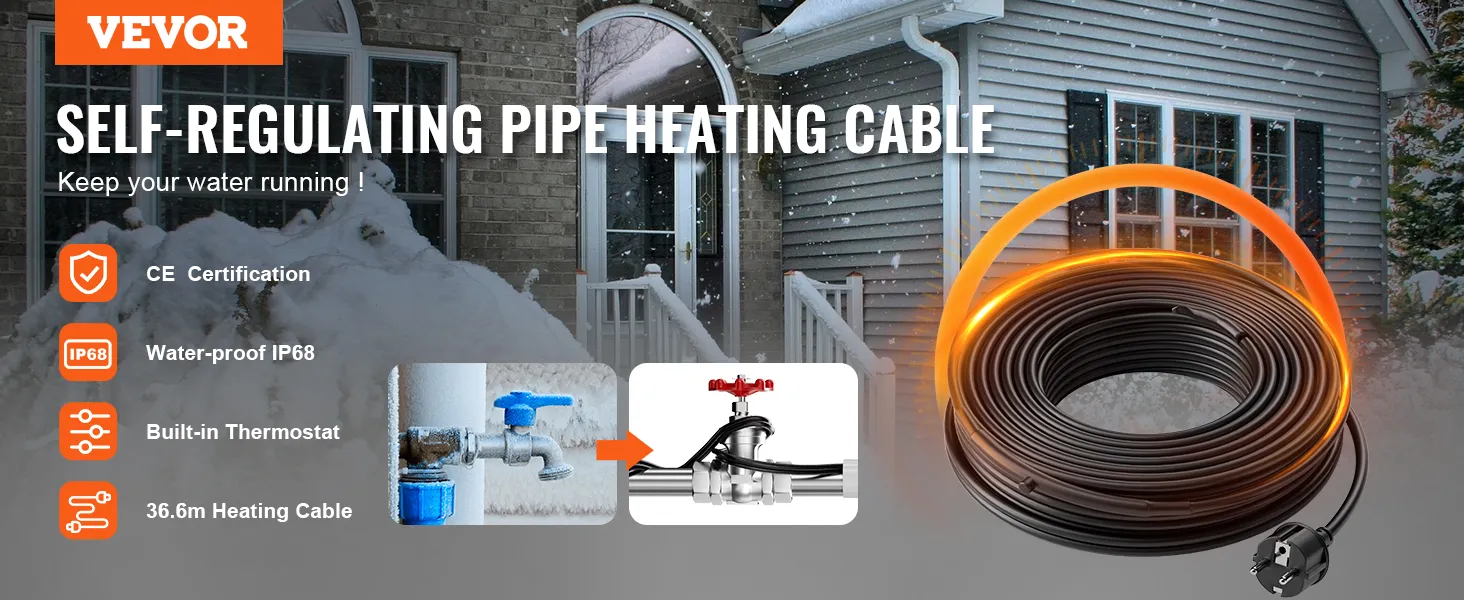 Si está instalando una casa rodante en climas helados, o desea mantener el flujo de agua ininterrumpido en una tubería de agua en su casa o jardín, ¡nuestro cable calefactor para tubería de agua eléctrica es lo que necesita! El cable de 120 pies viene con un termostato que enciende y apaga el flujo de electricidad según la temperatura. ¡Mantiene el agua corriendo incluso a 0 ℉! Deje que sus tuberías hagan lo que se supone que deben hacer y proporcióneles la protección que merecen. Prepárese para una calidad y confiabilidad en la que puede confiar, VEVOR.