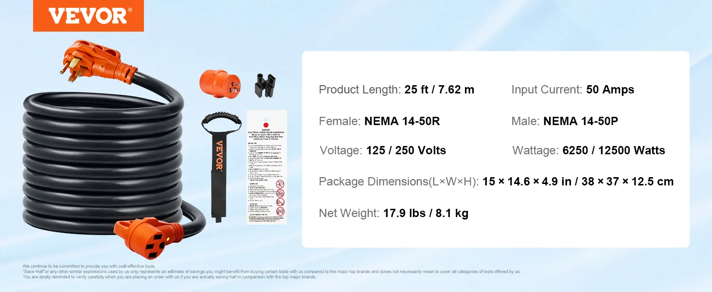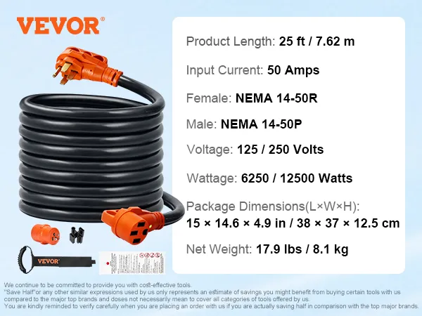 Ampliamente aplicable: nuestro cable para vehículos recreativos tiene 25 pies de largo, con enchufe macho NEMA 14-50P y enchufe hembra NEMA 14-50R. Viene con un adaptador de 15 A, lo que proporciona una fuente de alimentación de larga distancia más conveniente para equipos eléctricos de alta potencia, como vehículos recreativos y tranvías. Con una longitud en la que puede confiar y una calidad en la que puede confiar, ¡no puede equivocarse con VEVOR!