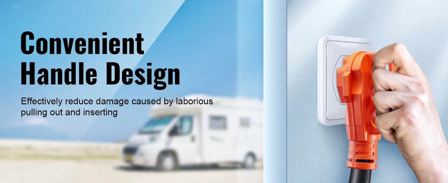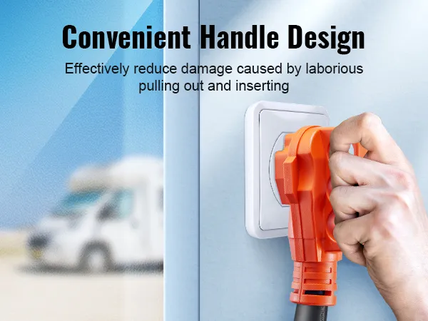 Cómodo de agarrar: ¿Estás cansado de enredos y nudos? ¡Bueno, arreglemos las cosas! El diseño del mango hace que el cable de alimentación de RV sea fácil de desenchufar/enchufar sin esfuerzo. Además, se adapta cómodamente a tu mano. Reduce el riesgo de daños en los enchufes y cables causados por el uso forzado y mejora la durabilidad y la seguridad.