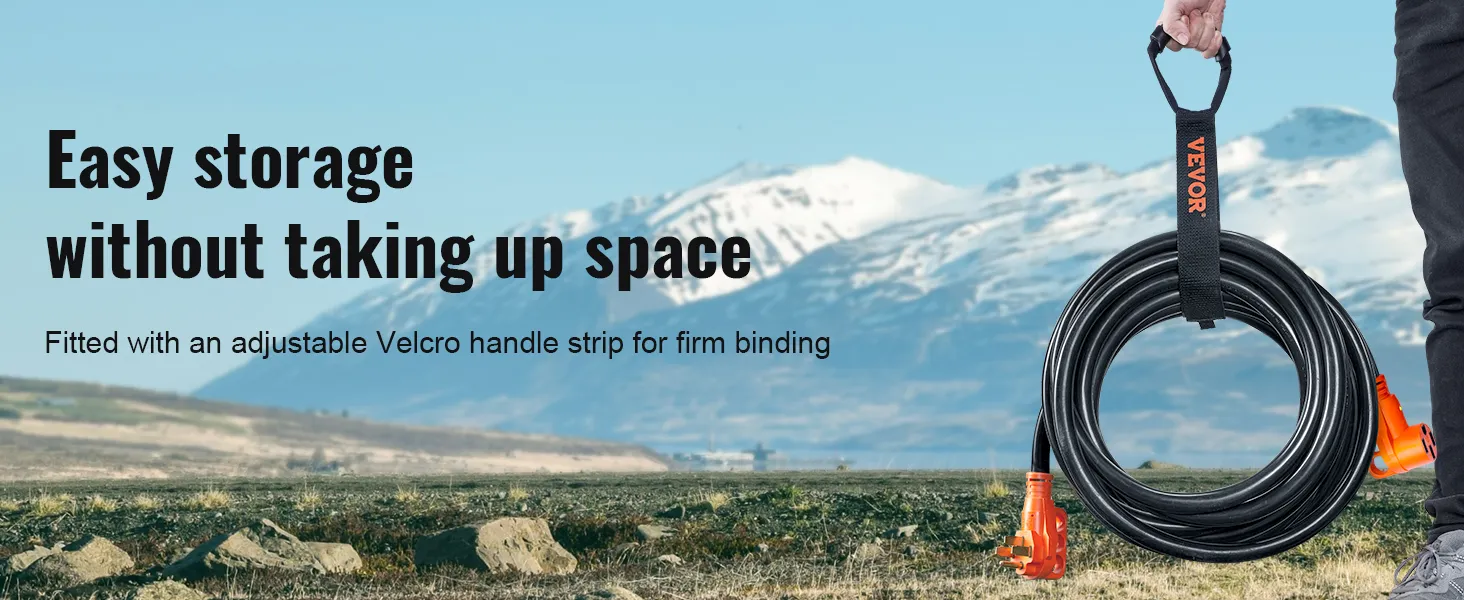 Almacene con facilidad: nuestro cable de extensión para vehículos recreativos está equipado con una correa de transporte ajustable y un diseño de velcro para una unión más firme. Cuando el cable de extensión de calibre no está en uso, se puede enrollar y almacenar fácilmente sin ocupar espacio en su casa rodante u hogar. Enrolle con facilidad y guárdelo para uso futuro. ¡Es fácil!