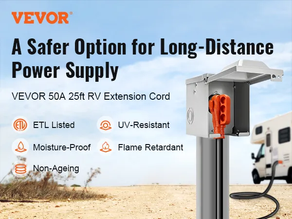 El cable de extensión VEVOR RV adopta alambre de cobre 100% y una capa exterior de PVC para manejar fácilmente las duras condiciones climáticas al aire libre. Cuenta con un mango portátil, un indicador LED y un adaptador de 15 A que se usa ampliamente en equipos eléctricos de alta potencia como vehículos recreativos. ¡Nuestra calidad te dejará boquiabierto!