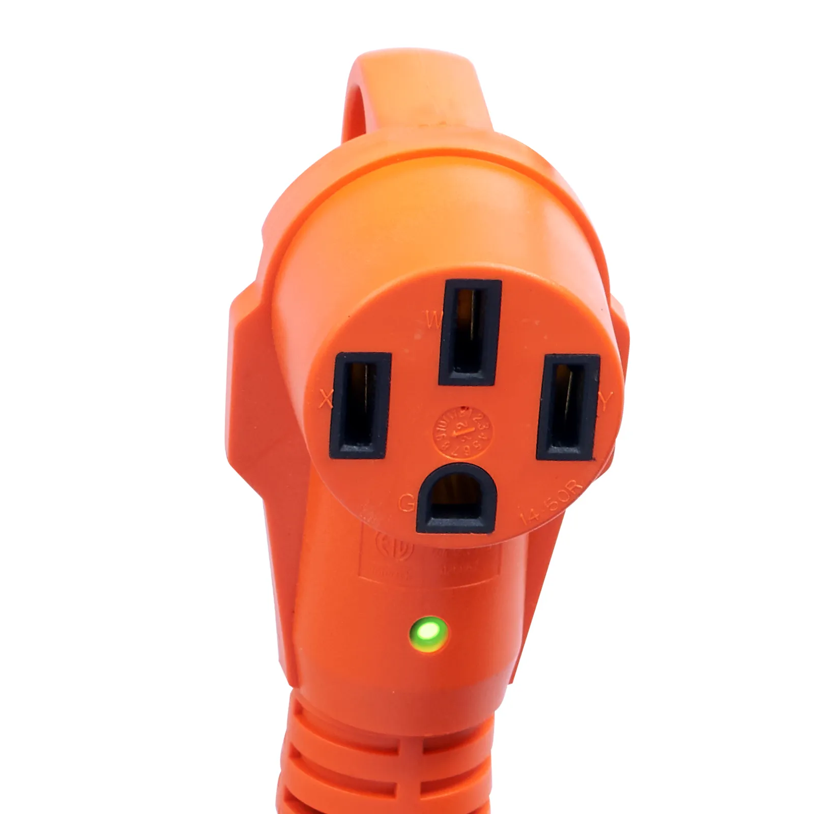 El cable eléctrico para vehículos recreativos cuenta con un enchufe hembra NEMA 14-50R con indicador LED, que se ilumina cuando se enciende y es una opción más segura para el suministro de energía a larga distancia.