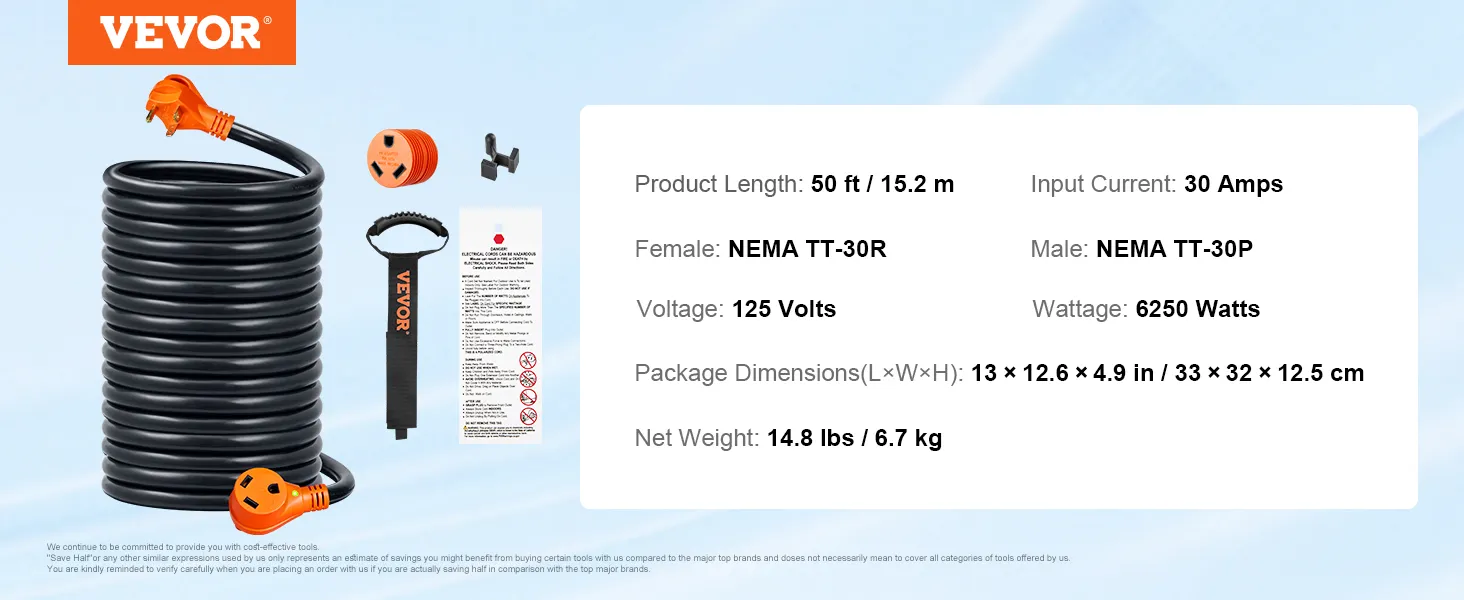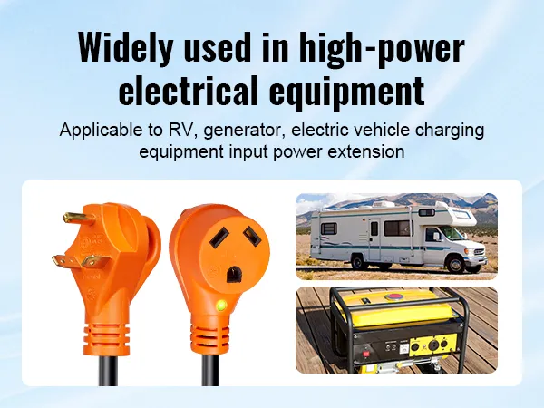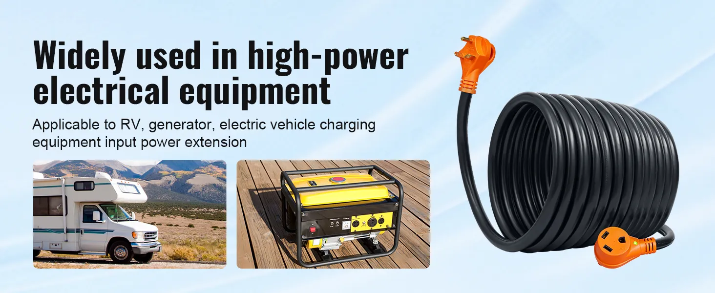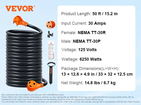 Ampliamente aplicable: nuestro cable de RV tiene 50 pies de largo, con enchufe macho de 30 A (NEMA TT-30P) y enchufe hembra de 30 A (NEMA TT-30R). Viene con un adaptador de 15 A, lo que proporciona una fuente de alimentación de larga distancia más conveniente para equipos eléctricos de alta potencia, como vehículos recreativos y tranvías. Con una longitud en la que puede confiar y una calidad en la que puede confiar, ¡no puede equivocarse con VEVOR!
