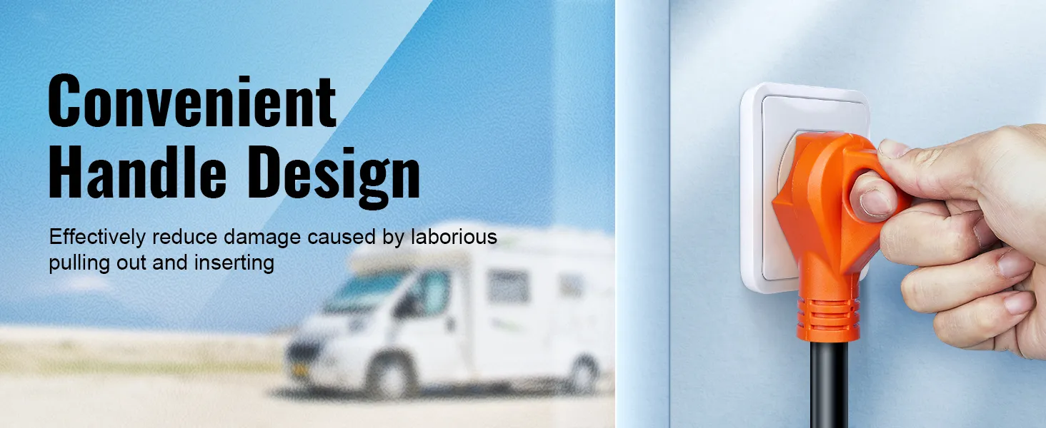 Cómodo de agarrar: ¿Estás cansado de enredos y nudos? ¡Bueno, arreglemos las cosas! El diseño del mango hace que el cable de alimentación de RV sea fácil de desenchufar/enchufar sin esfuerzo. Además, se adapta cómodamente a tu mano. Reduce el riesgo de daños en los enchufes y cables causados por el uso forzado y mejora la durabilidad y la seguridad.