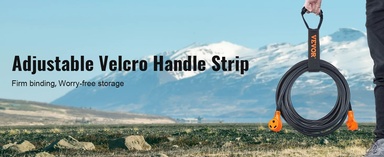 El cable de extensión VEVOR RV adopta alambre de cobre 100% y una capa exterior de PVC para manejar fácilmente las duras condiciones climáticas al aire libre. Cuenta con un mango portátil, un indicador LED y un adaptador de 15 A que se usa ampliamente en equipos eléctricos de alta potencia como vehículos recreativos. ¡Nuestra calidad te dejará boquiabierto!